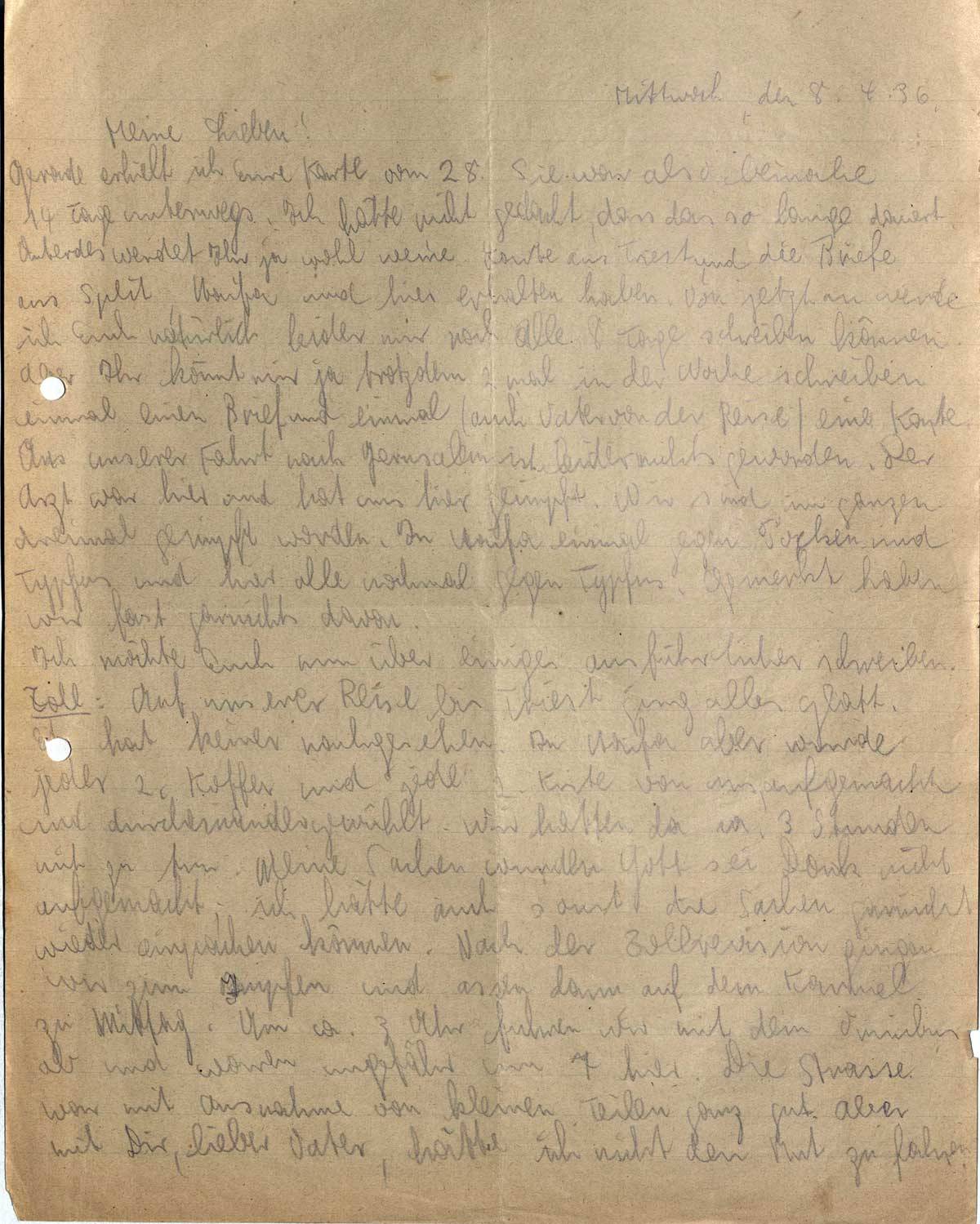 Gerade erhielt ich Eure Karte vom 28. Sie war also beinahe 14 Tage unterwegs. Ich hätte nicht gedacht, dass das so lange dauert. Unterdes werdet Ihr ja wohl meine Karte aus Triest und die Briefe aus Split, Haifa und hier erhalten haben. Von jetzt an werde ich Euch natürlich leider nur noch alle 8 Tage schreiben können. Aber Ihr könnt mir ja trotzdem 2. mal in der Woche schreiben einmal einen Brief und einmal (auch Vater von der Reise) eine Karte. Aus unserer Fahrt nach Jerusalem ist leider nichts geworden. Der Arzt war hier und hat uns hier geimpft. Wir sind im ganzen dreimal geimpft worden. In Haifa einmal gegen Pocken und Typhus und hier alle nochmal gegen Typhus. Gemerkt haben wir fast garnichts davon.