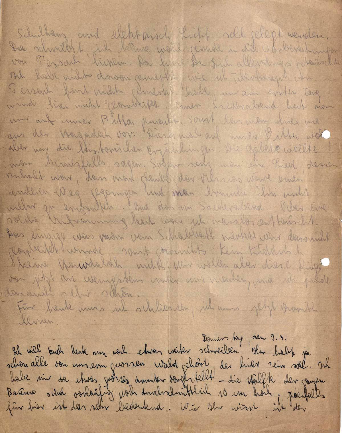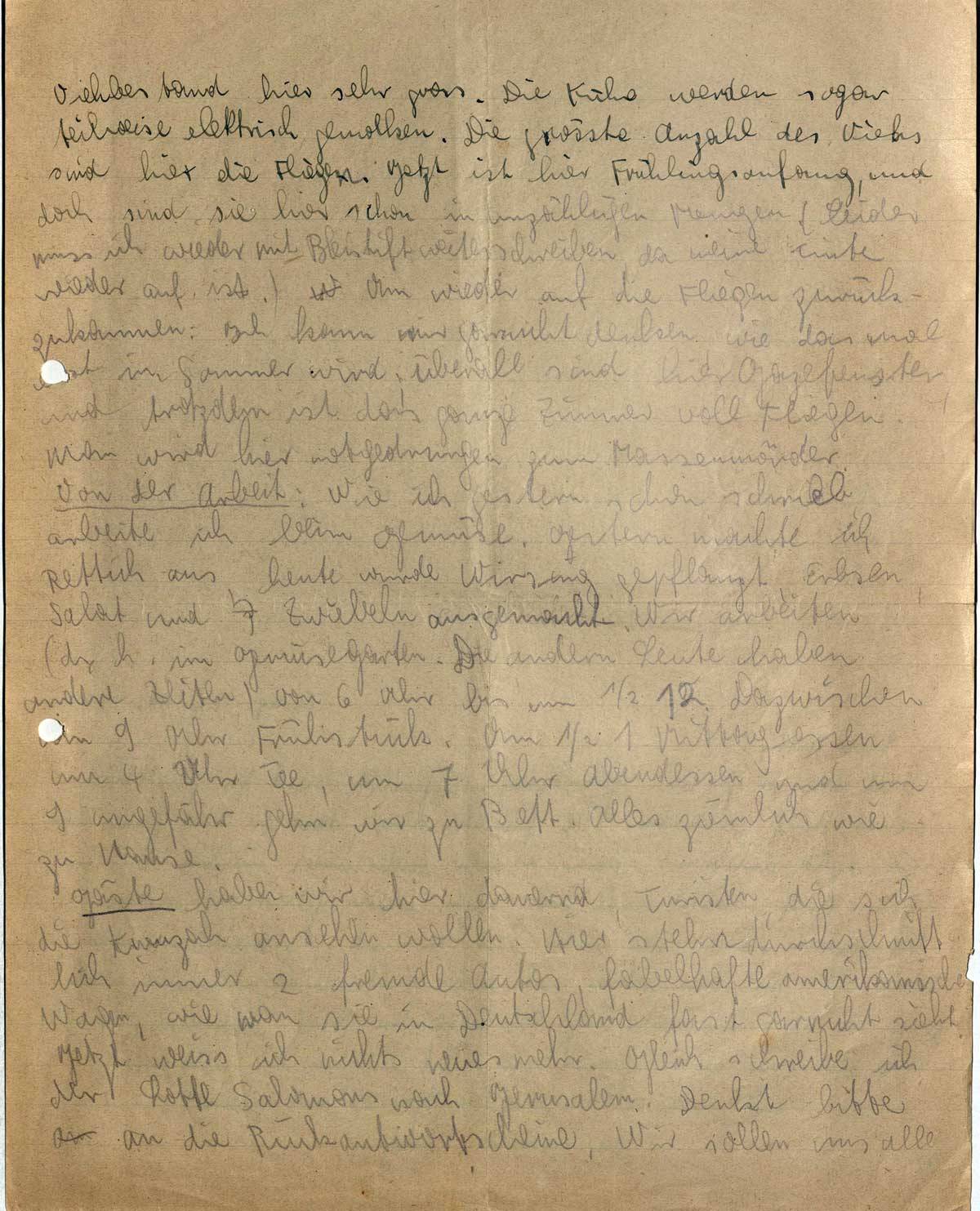 Von der Arbeit: Wie ich gestern schon schrieb, arbeite ich beim Gemüse. Gestern machte ich Rettich aus, heute wurde Wirsing gepflanzt, Erbsen, Salat und Zwiebeln ausgemacht. Wir arbeiten (d. h. im Gemüsegarten. Die andern Leute haben andere Zeiten) von 6 Uhr bis um ½ 12. Dazwischen um 9 Uhr Frühstück. Um ½ 1 Mittagessen um 4 Uhr Tee, um 7 Uhr Abendessen und um 9 ungefähr gehn wir zu Bett. Alles ziemlich wie zu Hause.