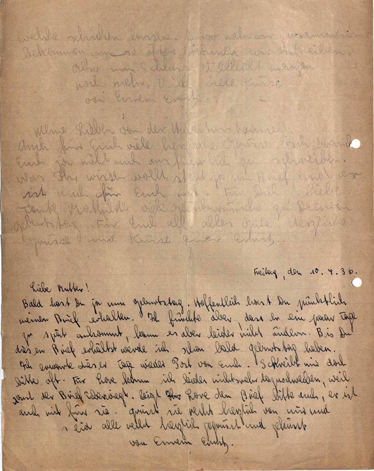Auch für Euch viele herzliche Grüsse. Ich brauche Euch ja nicht auch ausführlich zu schreiben. Was Ihr wissen wollt steht ja im Brief, und er ist auch für Euch mit. Für Dich, liebe Tante Mathilde, viele Glückwünsche zu Deinem Geburtstag. Für Euch alle alles Gute. Herzliche Grüsse und Küsse Euer Ernst.