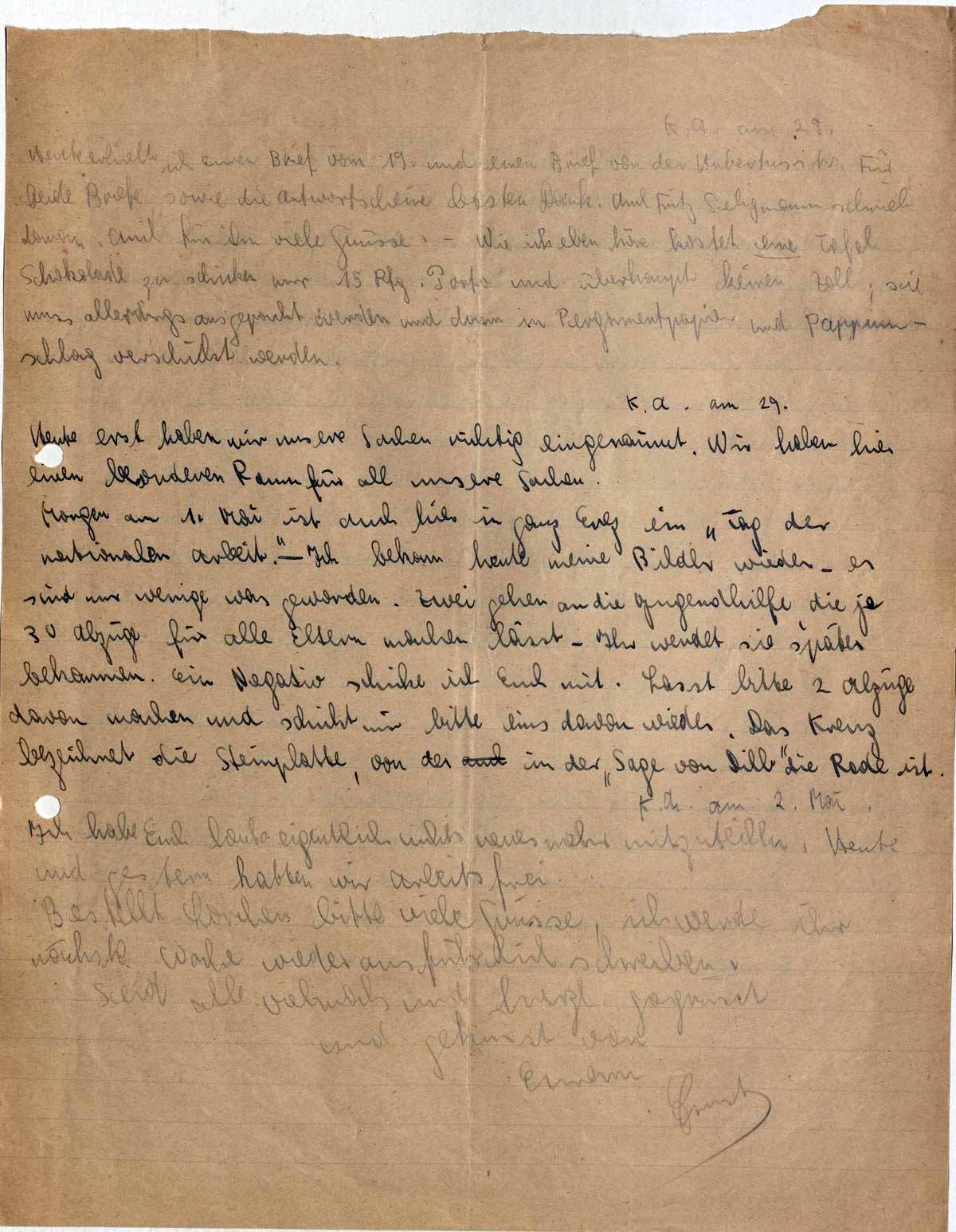 Heute erhielt ich einen Brief vom 19. und einen Brief von der Hubertusstr. Für beide Briefe, sowie die Antwortscheine besten Dank. Auch Fritz Seligmann schrieb daran. Auch für ihn viele Grüsse. - Wie ich eben höre kostet eine Tafel Schokolade zu schicken nur 15 Pfg. Porto und überhaupt keinen Zoll; sie muss allerdings ausgepackt werden und dann in Pergamentpapier und Pappumschlag verschickt werden.
