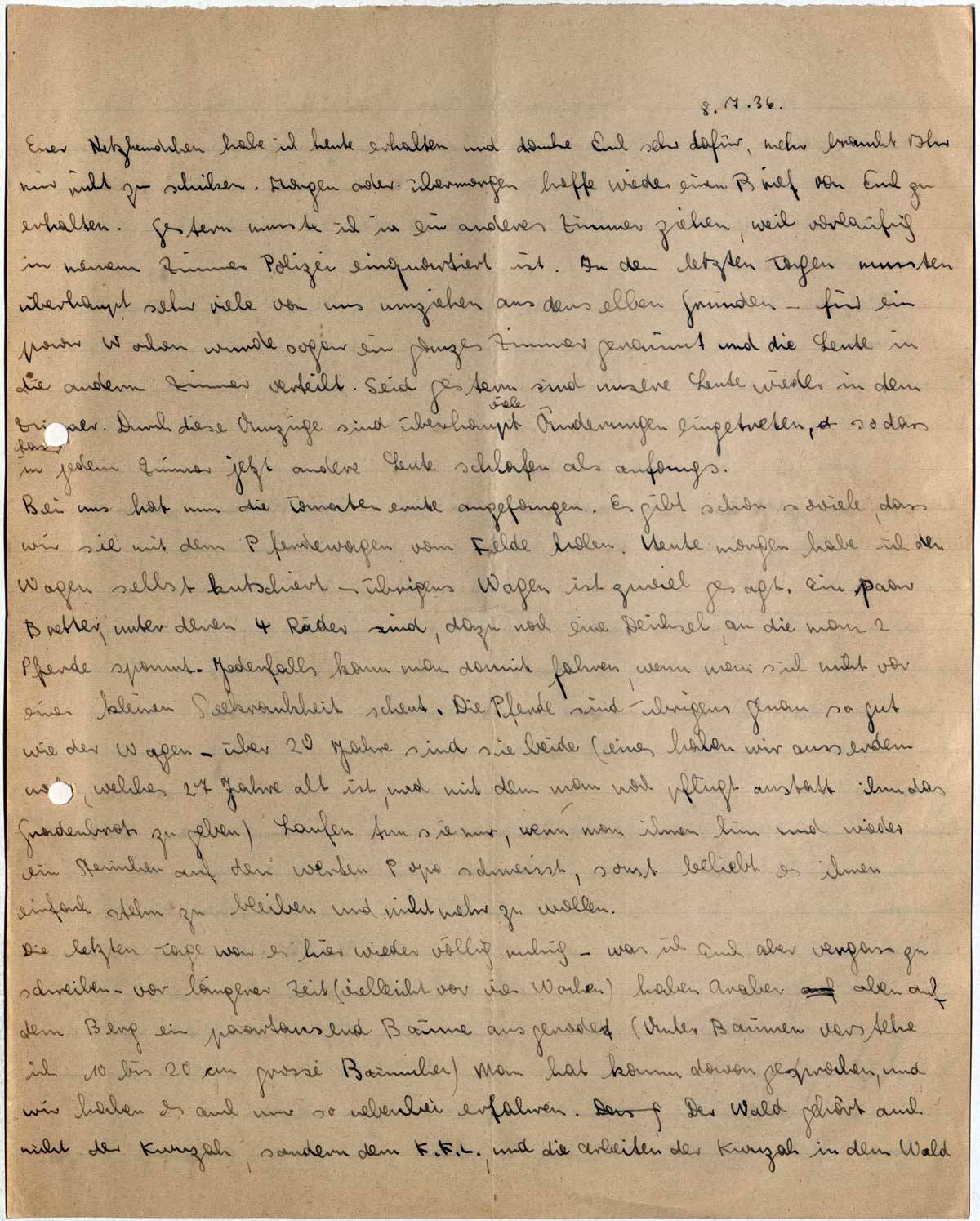 Euer Netzhemdchen habe ich heute erhalten und danke Euch sehr dafür, mehr braucht Ihr mir nicht zu schicken. Morgen oder übermorgen hoffe wieder einen Brief von Euch zu erhalten. Gestern musste ich in ein anderes Zimmer ziehen, weil vorläufig in meinem Zimmer Polizei einquartiert ist. In den letzten Tagen mussten überhaupt sehr viele von uns umziehen aus denselben Gründen - für ein paar Wochen wurde sogar ein ganzes Zimmer geräumt und die Leute in die andern Zimmer verteilt. Seid gestern sind unsere Leute wieder in dem Zimmer. Durch diese Auszüge sind überhaupt viele Änderungen eingetreten, so dass fast in jedem Zimmer jetzt andere Leute schlafen als anfangs.