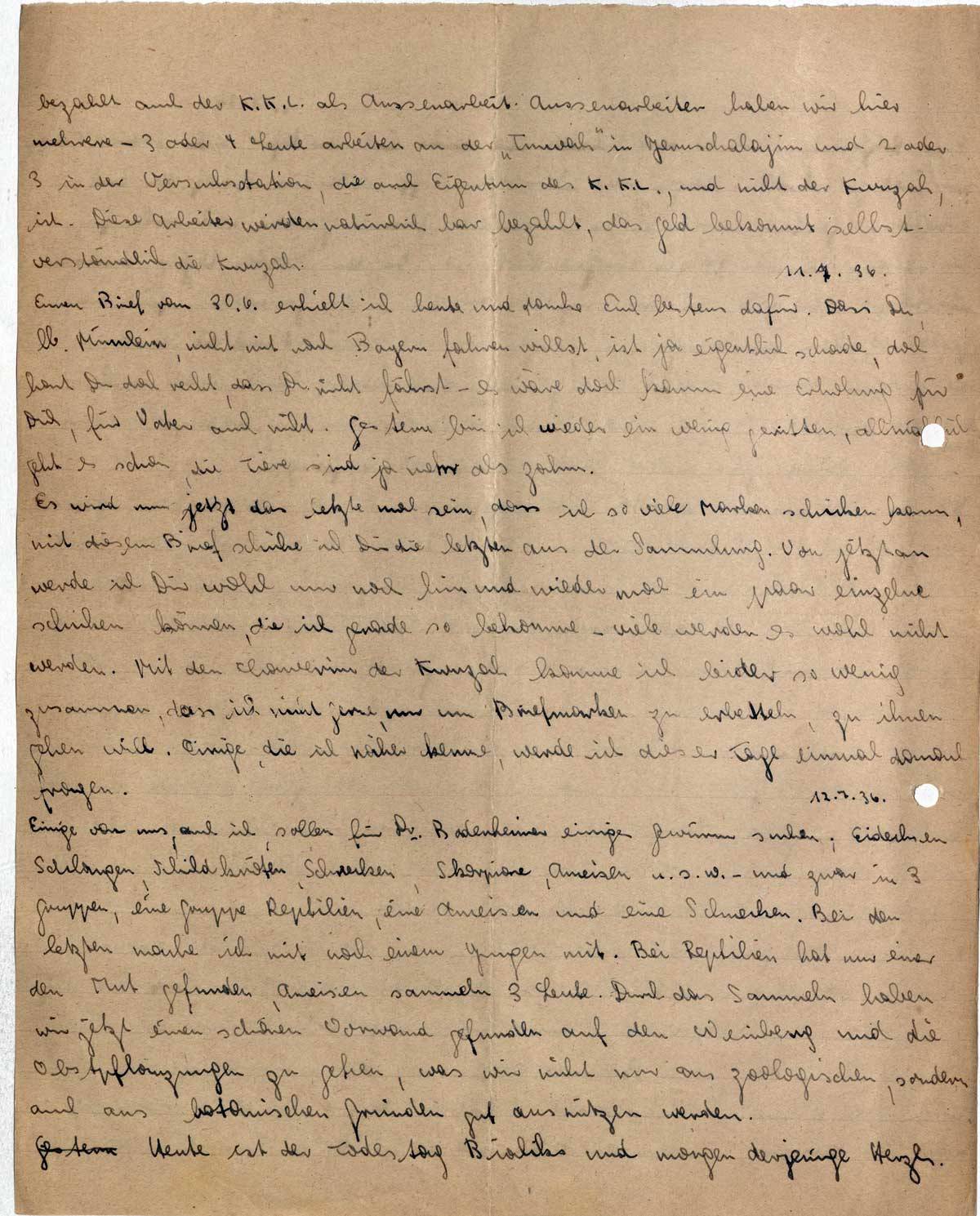 Einige von uns, auch ich, sollen für Dr. Bodenheimer einiges Gewürm suchen; Eidechsen, Schlangen, Schildkröten, Schnecken, Skorpione, Ameisen u.s.w. - und zwar in 3 Gruppen, eine Gruppe Reptilien, eine Ameisen und eine Schnecken. Bei den letzten mache ich mit noch einem Jungen mit. Bei Reptilien hat nur einer den Mut gefunden, Ameisen sammeln 3 Leute. Durch das Sammeln haben wir jetzt einen schönen Vorwand gefunden, auf den Weinberg und die Obstpflanzungen zu gehen, was wir nicht nur aus zoologischen, sondern auch aus botanischen Gründen gut ausnützen werden.
