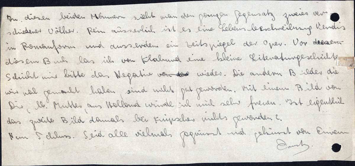 In diesen beiden Männern sieht man den ganzen Gegensatz zweier verschiedener Völker. Rein äusserlich ist es eine Lebensbeschreibung Verdis in Romanform und ausserdem ein Zeitspiegel der Oper. Vor diesem Buch las ich von Klabund eine kleine Literaturgeschichte. Schickt mir bitte das Negativ wieder. Die andern Bilder, die wir noch gemacht haben, sind nicht gut geworden. Mit einem Bild von Dir, lb. Mutter, aus Holland würde ich mich sehr freuen. Ist eigentlich das zweite Bild damals bei Knipscher nichts geworden?