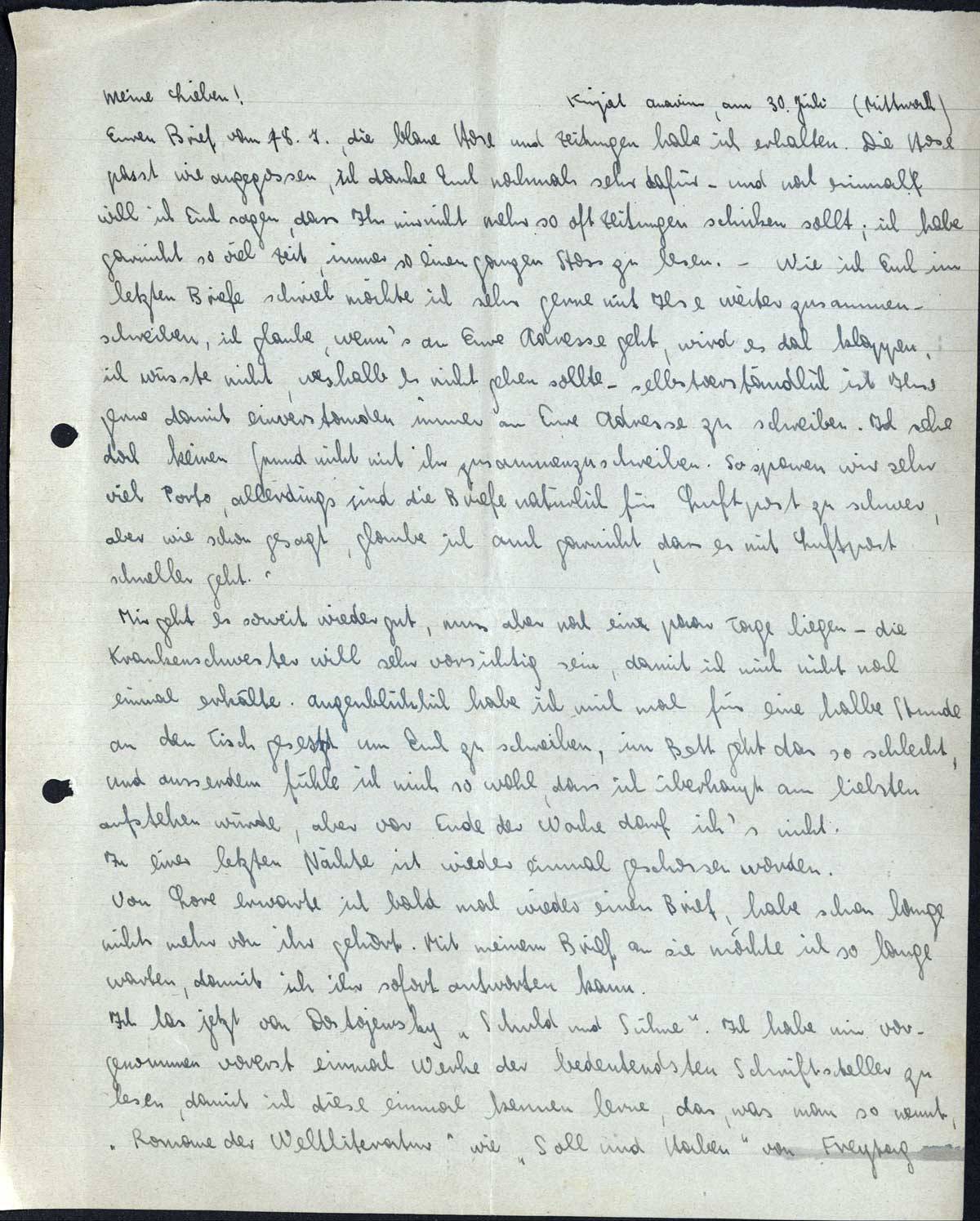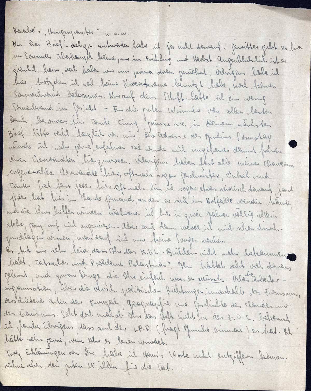 Euren Brief vom 18.7., die blaue Hose und Zeitungen habe ich erhalten. Die Hose passt wie angegossen, ich danke Euch nochmals sehr dafür - und noch einmal will ich Euch sagen, dass Ihr mir nicht mehr so oft Zeitungen schicken sollte; ich habe garnicht so viel Zeit, immer so einen ganzen Stoss zu lesen. - Wie ich Euch im letzten Briefe schrieb möchte ich sehr gerne mit Ilse weiter zusammenschreiben, ich glaube, wenn's an Eure Adresse geht, wird es doch klappen, ich wüsste nicht, weshalb es nicht gehen sollte - selbstverständlich ist Ilse gerne damit einverstanden immer an Eure Adresse zu schreiben. Ich sehe doch keinen Grund nicht mit ihr zusammenzuschreiben. So sparen wir sehr viel Porto, allerdings sind die Briefe natürlich für Luftpost zu schwer, aber wie schon gesagt, glaube ich auch garnicht, dass es mit Luftpost schneller geht. -