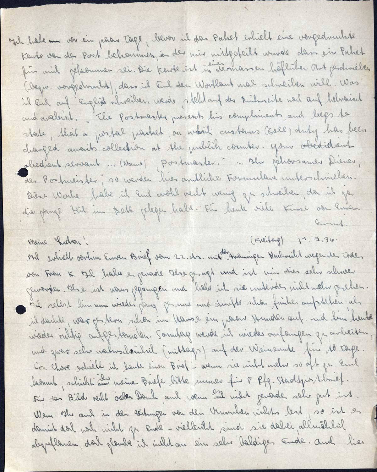 Ich habe vor ein paar Tagen, bevor ich das Paket erhielt eine vorgedruckte Karte von der Post bekommen, in der mir mitgeteilt wurde, dass ein Paket für mich gekommen sei. Die Karte ist in einer dermassen höflichen Art geschrieben (bezw. vorgedruckt), dass ich Euch den Wortlaut mal schreiben will. Was ich Euch auf Englisch schreiben werde, steht auf der Rückseite noch auf hebraisch und arabisch. „The Postmaster presents his compliments and begs to state, that a postal packet, on which customs (Zoll) duty has been charged awaits collection at the publik counter. Your obedient servant ... (Name), Postmaster. „... Ihr gehorsamer Diener, der Postmeister”, so werden hier amtliche Formulare unterschrieben. Diese Woche habe ich Euch wohl recht wenig zu schreiben, da ich ja die ganze Zeit im Bett gelegen habe. Für heute viele Küsse von Eurem