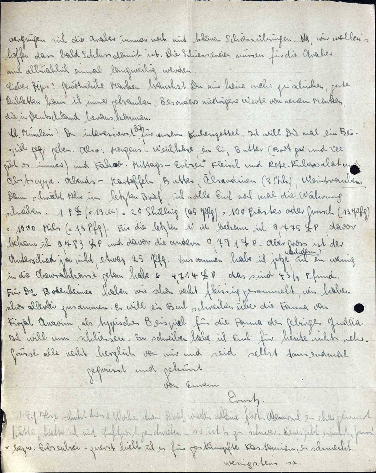 Dann schriebt Ihr im letzten Brief, ich solle Euch noch mal die Währung schreiben. 1 P₤ (= 13 M) = 20 Shilling (65 Pfg) = 100 Piaster oder Grusch (13 Pfg) = 1000 Mils (= 13 Pfg). Für die letzten 10 M bekam ich 0,775 ₤P, davor bekam ich 0,783 ₤P, und davor die anderen 0,791 ₤P. Aber gross ist der Unterschied ja nicht, etwa 25 Pfg. Zusammen habe ich jetzt, nachdem ich ein wenig in der Chewrahkasse getan habe 4,714 ₤P, das sind 43/4 Pfund. Für Dr. Bodenheimer haben wir schon recht fleissig gesammelt, wir haben schon allerlei zusammen. Er will ein Buch schreiben über die Fauna von Kirjal Anavim, als typisches Beispiel für die Fauna des Gebirges Judäa. Ich will nun schliessen. Zu schreiben habe ich Euch für heute nichts mehr.