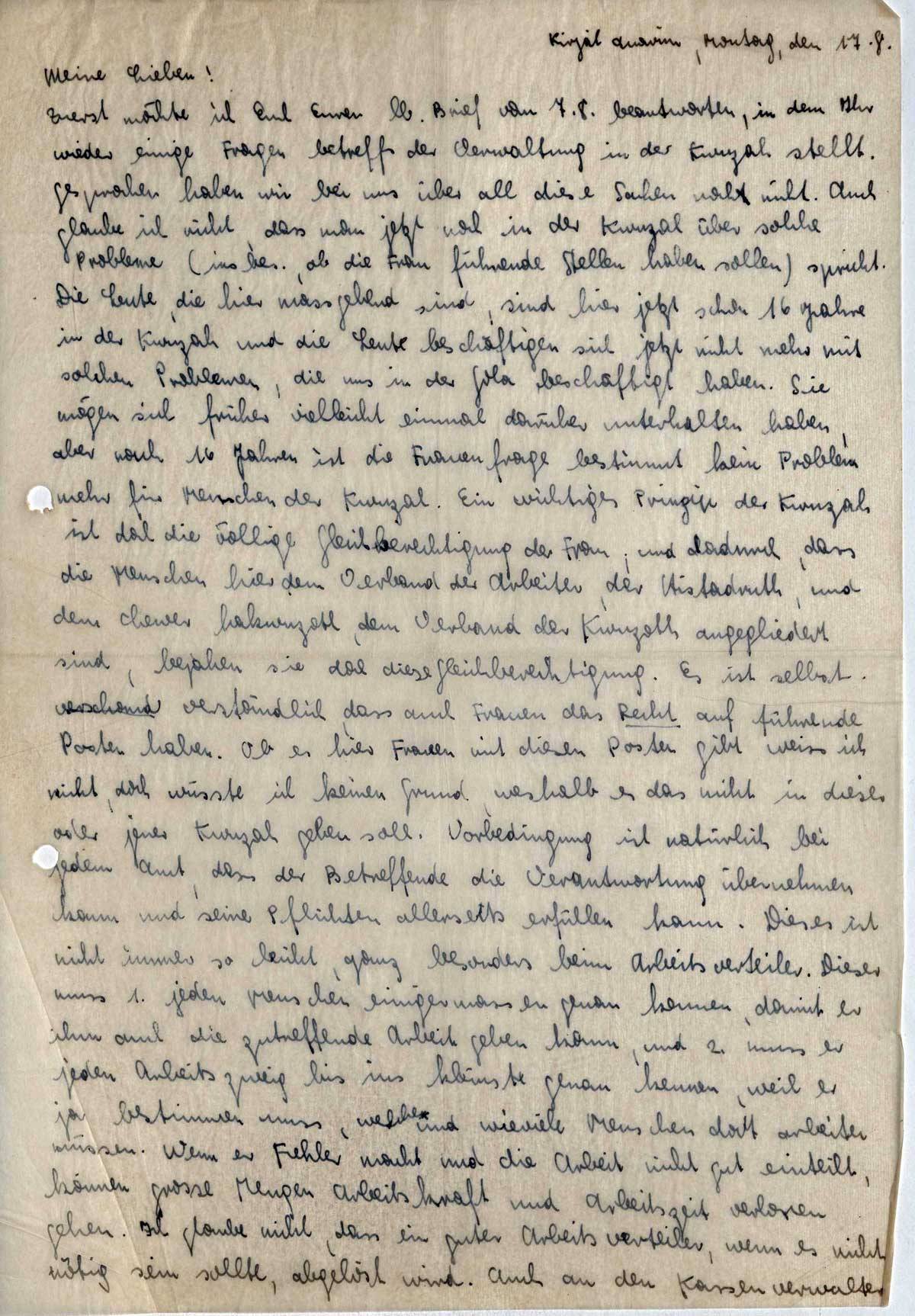 Zuerst möchte ich Euch Euren lb. Brief vom 7. 8. beantworten, in dem Ihr wieder einige Fragen betreffs der Verwaltung in der Kwuzah stellt. Gesprochen haben wir bei uns über all diese Sachen noch nicht. Auch glaube ich nicht, dass man jetzt noch in der Kwuzah über solche Probleme (insbes., ob die Frauen führende Stellen haben sollen) spricht. Die Leute, die hier massgebend sind, sind hier jetzt schon 16 Jahre in der Kwuzah und die Leute beschäftigen sich jetzt nicht mehr mit solchen Problemen, die uns in der Gola beschäftigt haben. Sie mögen sich früher vielleicht einmal darüber unterhalten haben, aber nach 16 Jahren ist die Frauenfrage bestimmt kein Problem mehr für Menschen der Kwuzah. Ein wichtiges Prinzip der Kwuzah ist doch die völlige Gleichberechtigung der Frau; und dadurch, dass die Menschen hier dem Verband der Arbeiter, der Histadruth, und dem Chewer Hakwuzoth, dem Verband der Kwuzoth, angegliedert sind, bejahen sie doch diese Gleichberechtigung. Es ist selbstverständlich, dass auch Frauen das Recht auf führende Posten haben. Ob es hier Frauen mit diesen Posten gibt, weiss ich nicht, doch wüsste ich keinen Grund, weshalb es das nicht in dieser oder jener Kwuzah geben soll. Vorbedingung ist natürlich bei jedem Amt, dass der Betreffende die Verantwortung übernehmen kann und seine Pflichten allerseits erfüllen kann. Dieses ist nicht immer so leicht, ganz besonders beim Arbeitsverteiler. Dieser muss 1. jeden Menschen einigermassen genau kennen, damit er ihm auch die zutreffende Arbeit geben kann, und 2. muss er jeden Arbeitszweig bis ins kleinste genau kennen, weil er ja bestimmen muss, welche und wieviele Menschen dort arbeiten müssen. Wenn er Fehler macht und die Arbeit nicht gut einteilt, könne grosse Mengen Arbeitskraft und Arbeitszeit verloren gehen. Ich glaube nicht, dass ein guter Arbeitsverteiler, wenn es nicht nötig sein sollte, abgelöst wird. Auch an den Kassenverwalter