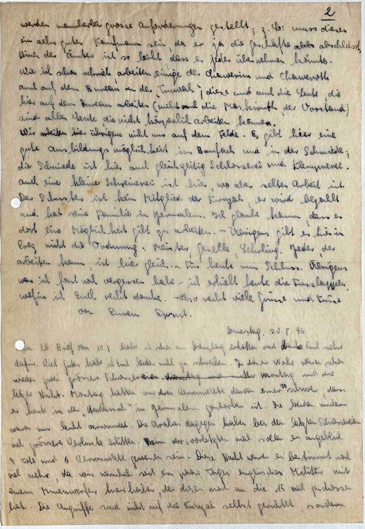 Wir arbeiten hier übrigens nicht nur auf dem Felde. Es gibt hier eine gute Ausbildungsmöglichkeit im Baufach und in der Schmiede; die Schmiede ist hier auch gleichzeitig Schlosserei und Klempnerei. Auch eine kleine Schreinerei ist hier, wo aber selten Arbeit ist. Der Schuster ist kein Mitglied der Kwuzah, er wird bezahlt und hat seine Familie in Jerusalem. Ich glaube kaum, dass es dort eine Möglichkeit gibt zu arbeiten. - Übrigens gibt es hier in Erez nicht die Ordnung: Meister, Geselle, Lehrling. Jeder, der arbeiten kann, ist hier gleich. - Für heute nun Schluss. Übrigens was ich fast noch vergessen habe - ich erhielt heute die Fusslappen, wofür ich Euch recht danke. - Also recht viele Grüsse und Küsse