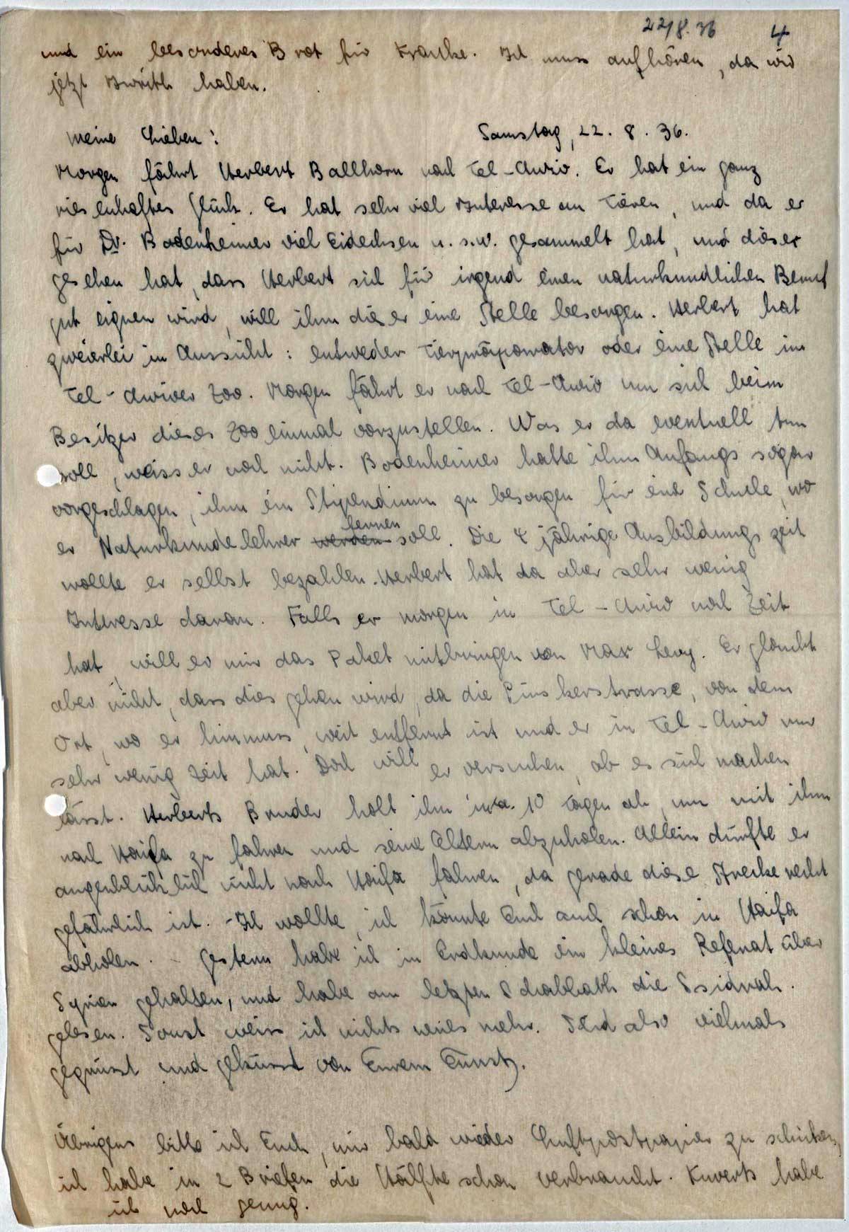 Morgen fährt Herbert Ballhorn nach Tel-Aviv. Er hat ein ganz riesenhaftes Glück. Er hat sehr viel Interesse an Tieren, und da er für Dr. Bodenheimer viel Eidechsen u.s.w. gesammelt hat, und dieser gesehen hat, dass Herbert sich für irgend einen naturkundlichen Beruf gut eignen wird, will ihm dieser eine Stelle besorgen. Herbert hat zweierlei in Aussicht: entweder Tierpräparator oder eine Stelle im Tel-Aviver Zoo. Morgen fährt er nach Tel-Aviv um sich beim Besitzer dieses Zoo einmal vorzustellen. Was er da eventuell tun soll, weiss er noch nicht. Bodenheimer hatte ihm Anfangs sogar vorgeschlagen, ihm ein Stipendium zu besorgen für eine Schule, wo er Naturkundelehrer lernen soll. Die 4jährige Ausbildungszeit wollte er selbst bezahlen. Herbert hat da aber sehr wenig Interesse daran. Falls er morgen in Tel-Aviv noch Zeit hat, will er mir das Paket mitbringen von Max Levy. Er glaubt aber nicht, dass dies gehen wird, da die Pinskerstrasse, von dem Ort, wo er hin muss, weit entfernt ist und er in Tel-Aviv nur sehr wenig Zeit hat. Doch will er versuchen, ob es sich machen lässt. Herberts Bruder holt ihn in ca. 10 Tagen ab, um mit ihm nach Haifa zu fahren und seine Eltern abzuholen. Allein durfte er augenblicklich nicht nach Haifa fahren, da gerade diese Strecke recht gefährlich ist. - Ich wollte, ich könnte Euch auch schon in Haifa abholen. - Gestern habe ich in Erdkunde ein kleines Referat über Syrien gehalten, und habe am letzten Schabbath die Sidrah gelesen. Sonst weiss ich nichts neues mehr. Seid also vielmals gegrüsst und geküsst von Eurem Ernst.