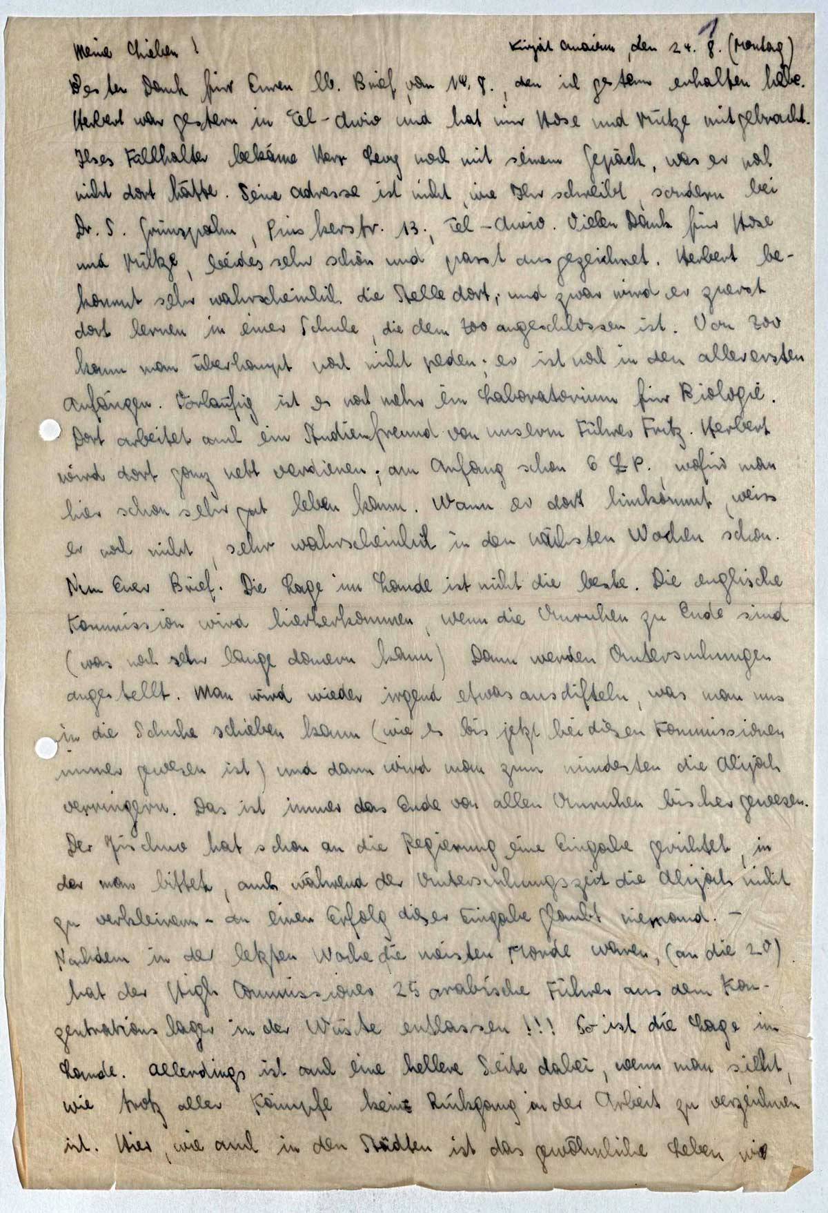 Besten Dank für Euren lb. Brief, vom 14.8., den ich gestern erhalten habe. Herbert war gestern in Tel-Aviv und hat mir Hose und Mütze mitgebracht. Ilses Füllhalter bekäme Herr Levy noch mit seinem Gepäck, was er noch nicht dort hätte. Seine Adresse ist nicht, wie Ihr schreibt, sondern bei Dr. S. Grünspahn, Pinskerstr. 13, Tel-Aviv. Vielen Dank für Hose und Mütze, beides sehr schön und passt ausgezeichnet. Herbert bekommt sehr wahrscheinlich die Stelle dort; und zwar wird er zuerst dort lernen in einer Schule, die dem Zoo angeschlossen ist. Von Zoo kann man überhaupt noch nicht reden; er ist noch in den allerersten Anfängen. Vorläufig ist es noch mehr ein Laboratorium für Biologie. Dort arbeitet auch ein Studienfreund von unserm Führer Fritz. Herbert wird dort ganz nett verdienen; am Anfang schon 6 ₤P., wofür man hier schon sehr gut leben kann. Wann er dort hinkommt, weiss er noch nicht, sehr wahrscheinlich in den nächsten Wochen schon.