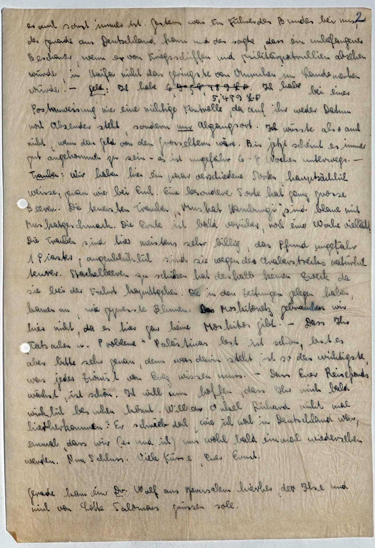 es auch sonst immer ist. Gestern war ein Führer des Bundes bei uns, der gerade aus Deutschland kam und der sagte, dass ein unbefangener Beschauer, wenn er von Kriegsschiffen und Militärpatrouillen absehen würde, in Haifa nicht das geringste von Unruhen im Lande merken würde! - Geld: Ich habe 5,489 ₤P. Ich habe bei einer Postanweisung nie eine richtige Kontrolle, da auf ihr weder Datum noch Absender steht, sondern nur Abgangsort. Ich wüsste also auch nicht, wenn das Geld von den Grosseltern wäre. Bis jetzt scheint es immer gut angekommen zu sein - es ist ungefähr 6-8 Wochen unterwegs. - Trauben: Wir haben hier ein paar verschiedene Sorten, hauptsächlich weisse, genau wie bei Euch. Eine besondere Sorte hat ganz grosse Beeren. Die teuersten Trauben, „Muskat Hamburgi”, sind blaue mit Muskatgeschmack. Die Ernte ist bald vorüber, noch eine Woche vielleicht. Die Trauben sind hier meistens sehr billig, das Pfund ungefähr 1 Piaster; augenblicklich sind sie wegen des Araberstreiks natürlich teurer. Stachelbeeren zu schicken hat deshalb keinen Zweck, da sie bei der Fahrt kaputtgehen. Die in den Zeitungen gelegen haben, kamen an, wie gepresste Blumen. Das Moskitonetz gebrauchen wir hier nicht, da es hier gar keine Moskitos gibt. - Dass Ihr „Tatsachen u. Probleme” Palästinas lest ist schön, lest es aber bitte sehr genau, denn was darin steht, ist so das wichtigste, was jeder Zionist von Erez wissen muss. - Dass Euer Reisefonds wächst, ist schön. Ich will nun hoffen, dass Ihr mich bald wirklich besuchen könnt. Will Onkel Richard nicht mal hierherkommen? Er schrieb doch, wie ich noch in Deutschland war, einmal, dass wir (er und ich) uns wohl bald einmal wiedersehen werden. Nun Schluss. Viele Küsse, Euer Ernst.