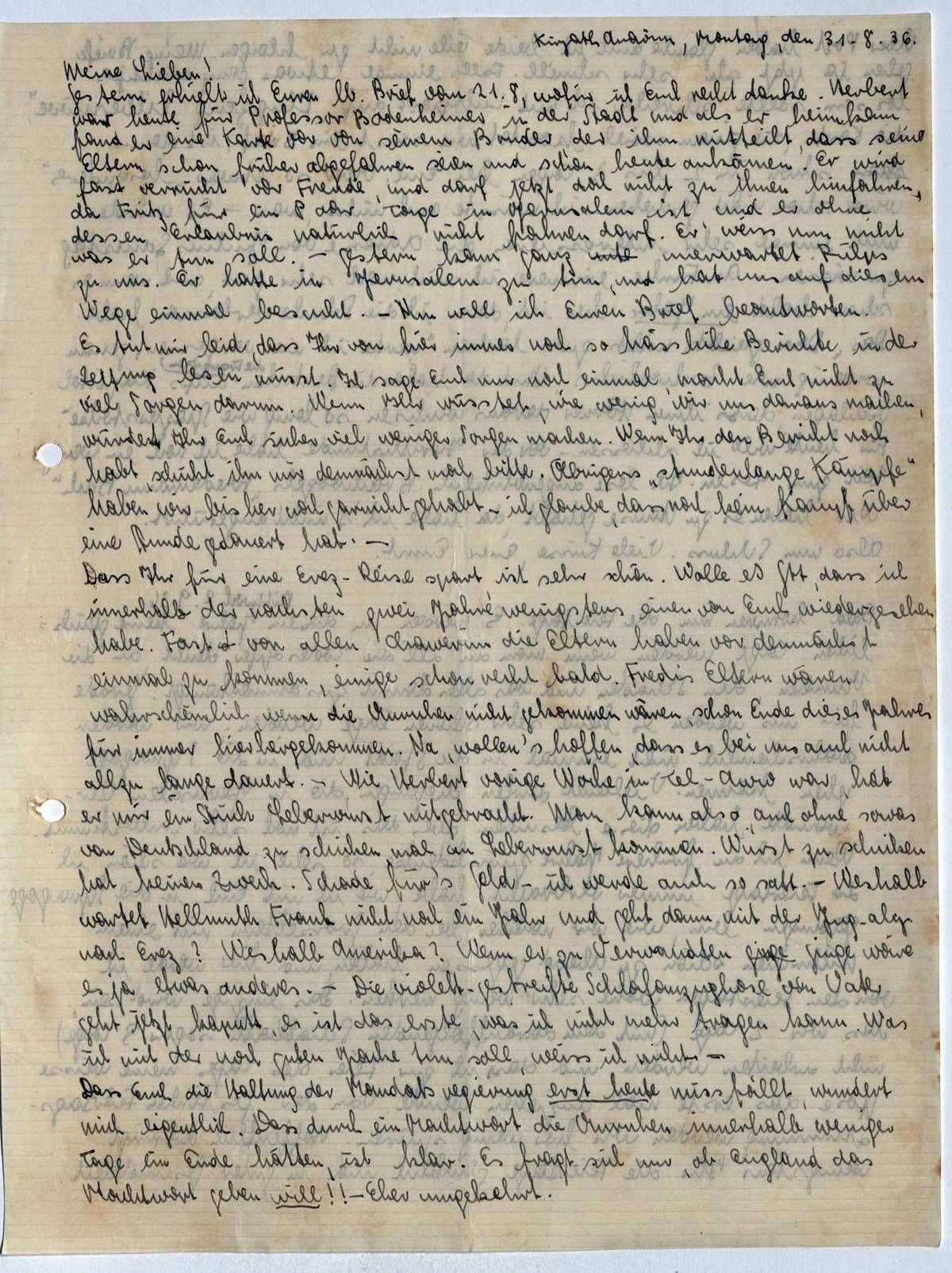 Gestern erhielt ich Euren lb. Brief vom 21.8., wofür ich Euch recht danke. Herbert war heute für Professor Bodenheimer in der Stadt und als er heimkam, fand er eine Karte vor von seinem Bruder, der ihm mitteilt, dass seine Eltern schon früher abgefahren seien und schon heute ankämen. Er wird fast verrückt vor Freude, und darf jetzt doch nicht zu ihnen hinfahren, da Fritz für eine paar Tage in Jerusalem ist, und er ohne dessen Erlaubnis natürlich nicht fahren darf. Er weiss nun nicht was er tun soll. - Gestern kam ganz unerwartet Rülps zu uns. Er hatte in Jerusalem zu tun, und hat uns auf diesem Wege einmal besucht. - Nun will ich Euren Brief beantworten. Es tut mir leid, dass Ihr von hier immer noch so hässliche Berichte in der Zeitung lesen müsst. Ich sage Euch nur noch einmal, macht Euch nicht zu viel Sorgen darum. Wenn Ihr wüsstet, wie wenig wir uns daraus machen, würdet Ihr Euch sicher viel weniger Sorgen machen. Wenn Ihr den Bericht noch habt, schickt ihn mir demnächst mal bitte. Übrigens „stundenlange Kämpfe” haben wir bisher noch garnicht gehabt - ich glaube, dass noch kein Kampf über eine Stunde gedauert hat. -
