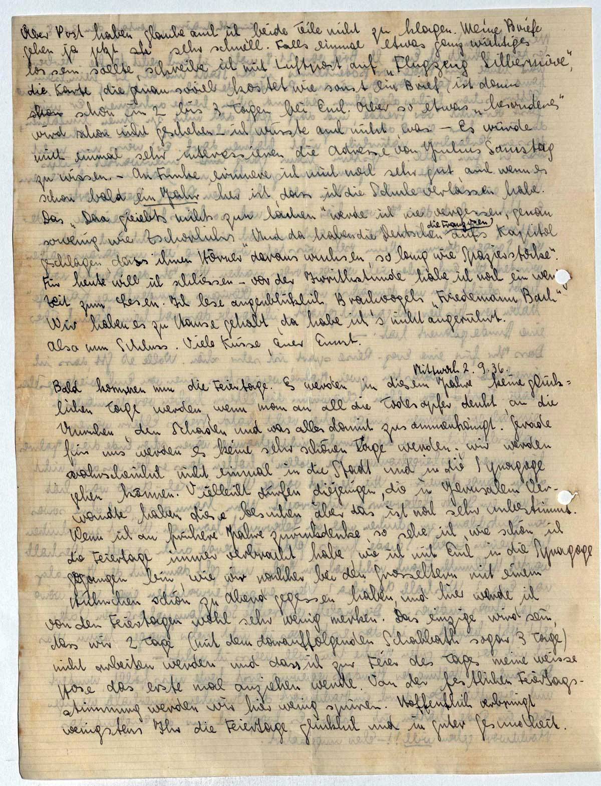 Bald kommen nun die Feiertage. Es werden in diesem Jahre keine glücklichen Tage werden, wenn man an all die Todesopfer denkt, an die Unruhen, den Schaden und was alles damit zusammenhängt. Gerade für uns werden es keine sehr schönen Tage werden; wir werden wahrscheinlich nicht einmal in die Stadt und in die Synagoge gehen können. Vielleicht dürfen diejenigen, die in Jerusalem Verwandte haben, diese besuchen, aber das ist noch sehr unbestimmt. Wenn ich an frühere Jahre zurückdenke, so sehe ich, wie schön ich die Feiertage immer verbracht habe, wie ich mit Euch in die Synagoge gegangen bin, wie wir nachher bei den Grosseltern mit einem Hühnchen schön zu Abend gegessen haben, und hier werde ich von den Feiertagen wohl sehr wenig merken. Das einzige wird sein, dass wir 2 Tage (mit dem darauffolgenden Schabbath sogar 3 Tage) nicht arbeiten werden und dass ich zur Feier des Tages meine weisse Hose das erste Mal anziehen werde. Von der festlichen Feiertagsstimmung werden wir hier wenig spüren. Hoffentlich verbringt wenigstens Ihr die Feiertage glücklich und in guter Gesundheit.