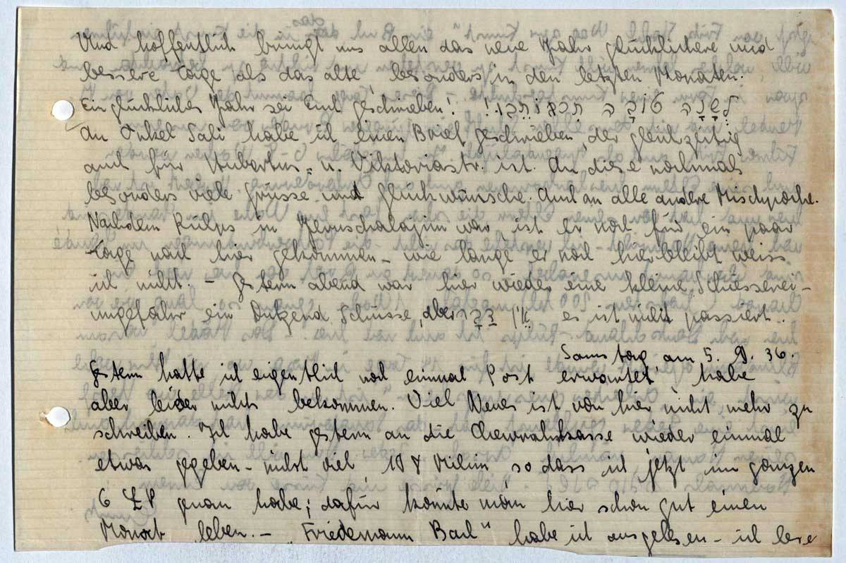 Dass Ihr für eine Erez-Reise spart, ist sehr schön. Wolle es Gtt, dass ich innerhalb der nächsten zwei Jahre wenigstens einen von Euch wiedergesehen habe. Fast von allen Chawerim die Eltern haben vor demnächst einmal zu kommen, einige schon recht bald. Fredis Eltern wären wahrscheinlich, wenn die Unruhen nicht gekommen wären, schon Ende dieses Jahres für immer hierhergekommen. Na, wollen's hoffen, dass es bei uns auch nicht allzu lange dauert. - Wie Herbert vorige Woche in Tel-Aviv war, hat er mir ein Stück Leberwurst mitgebracht. Man kann also, auch ohne sowas von Deutschland zu schicken, mal an Leberwurst kommen. Wurst zu schicken hat keinen Zweck. Schade für's Geld - ich werde auch so satt. - Weshalb wartet Hellmuth Frank nicht noch ein Jahr und geht dann mit der Jug.-Alij. nach Erez? Weshalb Amerika? Wenn er zu Verwandten ginge, wäre es ja etwas anderes. - Die violett-gestreifte Schlafanzughose von Vater geht jetzt kaputt, es ist das erste, was ich nicht mehr tragen kann. Was ich mit der noch guten Jacke tun soll, weiss ich nicht. -