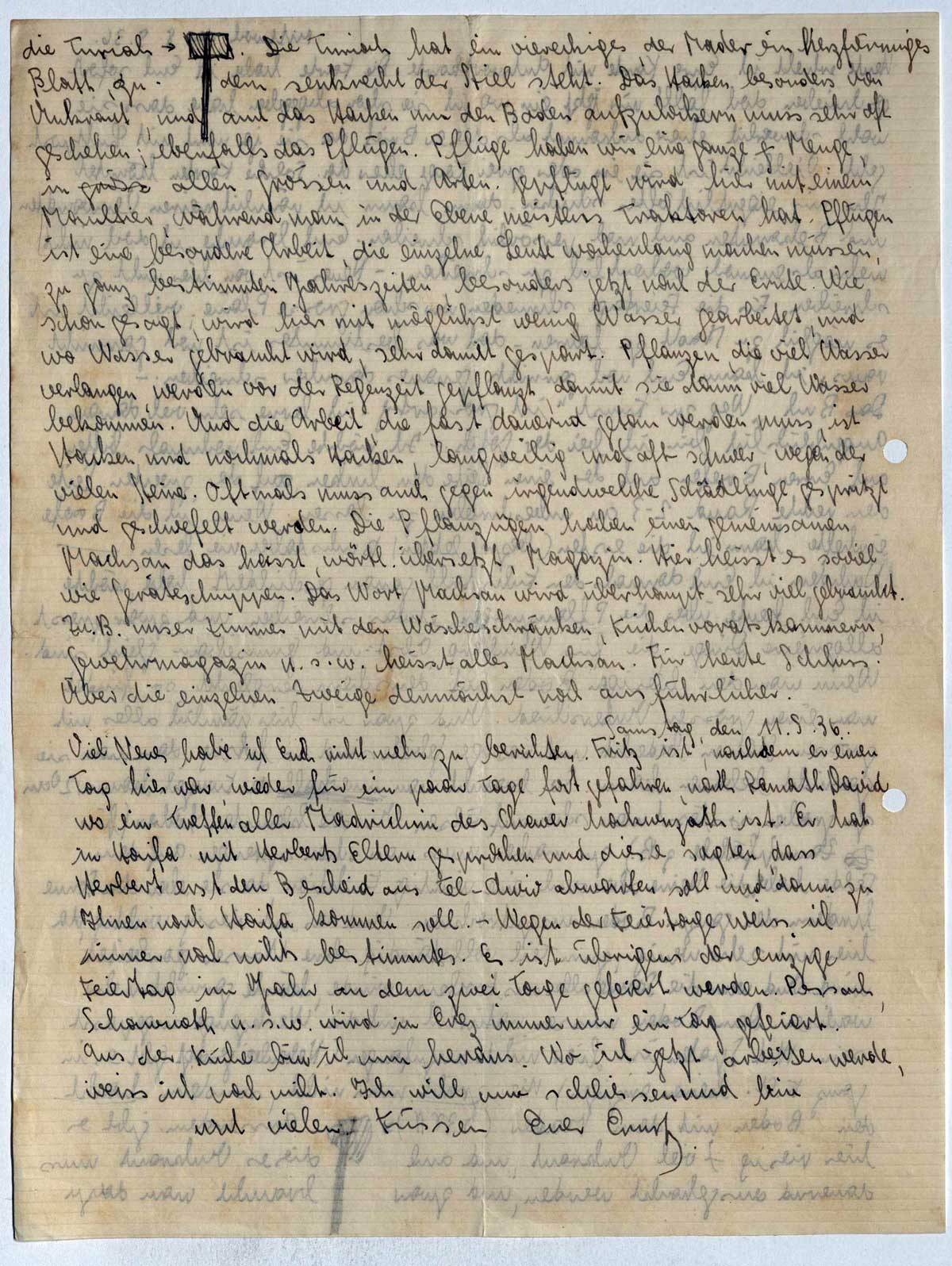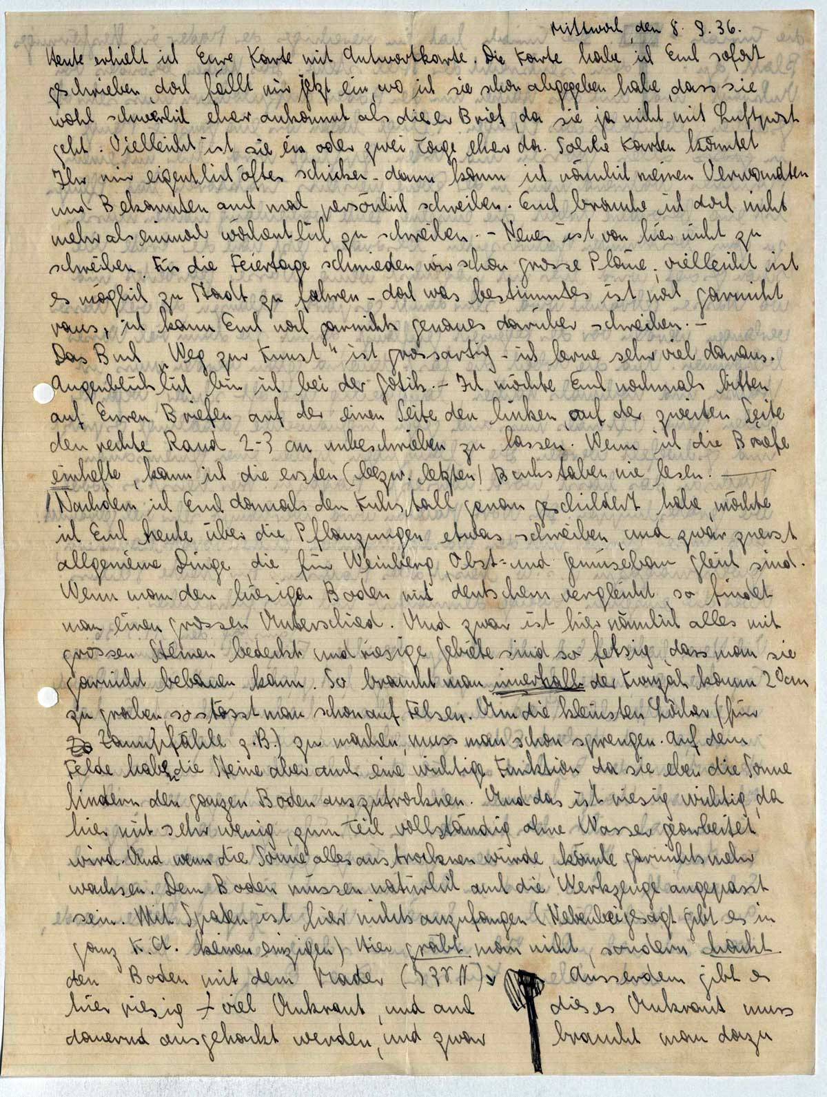 Nachdem ich Euch damals den Kuhstall genau geschildert habe, möchte ich Euch heute über die Pflanzungen etwas schreiben, und zwar zuerst allgemeine Dinge, die für Weinberg, Obst- und Gemüsebau gleich sind. Wenn man den hiesigen Boden mit deutschem vergleicht, so findet man einen grossen Unterschied. Und zwar ist hier nämlich alles mit grossen Steinen bedeckt und riesige Gebiete sind so felsig, dass man sie garnicht bebauen kann. So braucht man innerhalb der Kwuzah kaum 20 cm zu graben, so stösst man schon auf Felsen. Um die kleinsten Löcher (für Zaunpfähle z. B.) zu machen, muss man schon sprengen. Auf dem Felde haben die Steine aber auch eine wichtige Funktion, da sie eben die Sonne hindern den ganzen Boden auszutrocknen. Und das ist riesig wichtig, da hier mit sehr wenig, zum Teil vollständig ohne Wasser gearbeitet wird. Und wenn die Sonne alles austrocknen würde, könnte garnichts mehr wachsen. Dem Boden müssen natürlich auch die Werkzeuge angepasst sein. Mit Spaten ist hier nichts anzufangen. (Nebenbei gesagt gibt es in ganz K. A. keinen einzigen) Hier gräbt man nicht, sondern hackt den Boden mit dem Mader ([..]). Ausserdem gibt es hier riesig viel Unkraut, und auch dieses Unkraut muss dauernd ausgehackt werden, und zwar braucht man dazu