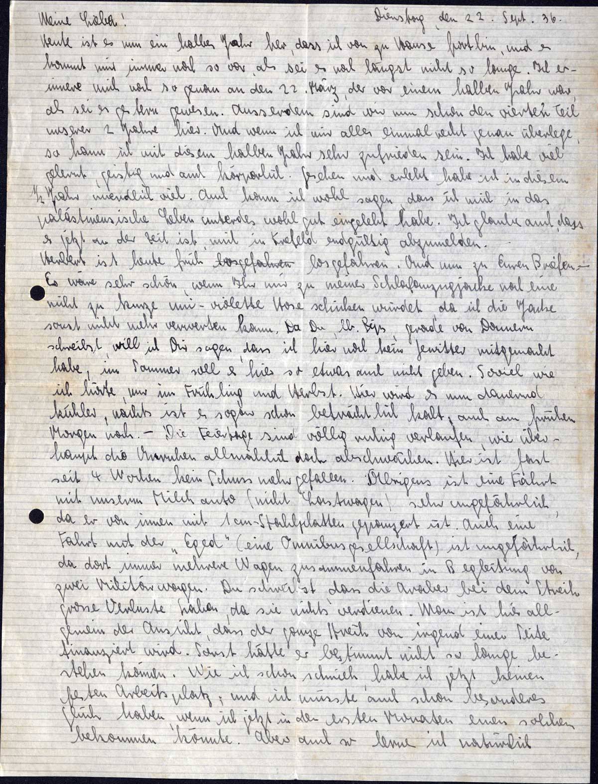 Herbert ist heute früh losgefahren. Und nun zu Euren Briefen. - Es wäre sehr schön, wenn Ihr mir zu meiner Schlafanzugjacke noch eine nicht zu kurze uni-violette Hose schicken würdet, da ich die Jacke sonst nicht mehr verwerten kann. Da Du, lb. Pips, gerade von Donnern schreibst, will ich Dir sagen, dass ich hier noch kein Gewitter mitgemacht habe, im Sommer soll es hier so etwas auch nicht geben. Soviel wie ich hörte, nur im Frühling und Herbst. Hier wird es nun dauernd kühler, nachts ist es sogar schon beträchtlich kalt, auch am frühen Morgen noch. - Die Feiertage sind völlig ruhig verlaufen, wie überhaupt die Unruhen allmählich doch abschwächen. Hier ist fast seit 4 Wochen kein Schuss mehr gefallen. Übrigens ist eine Fahrt mit unserm Milchauto (nicht Lastwagen) sehr ungefährlich, da er von innen mit 1 cm-Stahlplatten gepanzert ist. Auch eine Fahrt mit der „Eged” (eine Omnibusgesellschaft) ist ungefährlich, da dort immer mehrere Wagen zusammenfahren in Begleitung von zwei Militärwagen. Du schreibst, dass die Araber bei dem Streik grosse Verluste haben, da sie nichts verdienen. Man ist hier allgemein der Ansicht, dass der ganze Streik von irgend einer Seite finanziert wird. Sonst hätte er bestimmt nicht so lange bestehen können. Wie ich schon schrieb, habe ich jetzt keinen festen Arbeitsplatz; und ich müsste auch schon besonderes Glück haben, wenn ich jetzt in den ersten Monaten einen solchen bekommen könnte. Aber auch so lerne ich natürlich