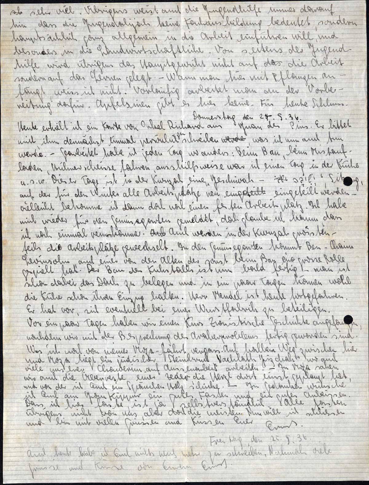 sehr viel. Übrigens weist auch die Jugendhilfe immer darauf hin, dass die Jugendalijah keine Fachausbildung bedeutet, sondern hauptsächlich ganz allgemein in die Arbeit einführen will, und besonders in die Landwirtschaftliche. Von seitens der Jugendhilfe wird übrigens das Hauptgewicht nicht auf die Arbeit sondern auf das Lernen gelegt. - Wann man hier mit Pflanzen anfängt, weiss ich nicht. Vorläufig arbeitet man an der Vorbereitung dafür. Apfelsinen gibt es hier keine. Für heute Schluss.