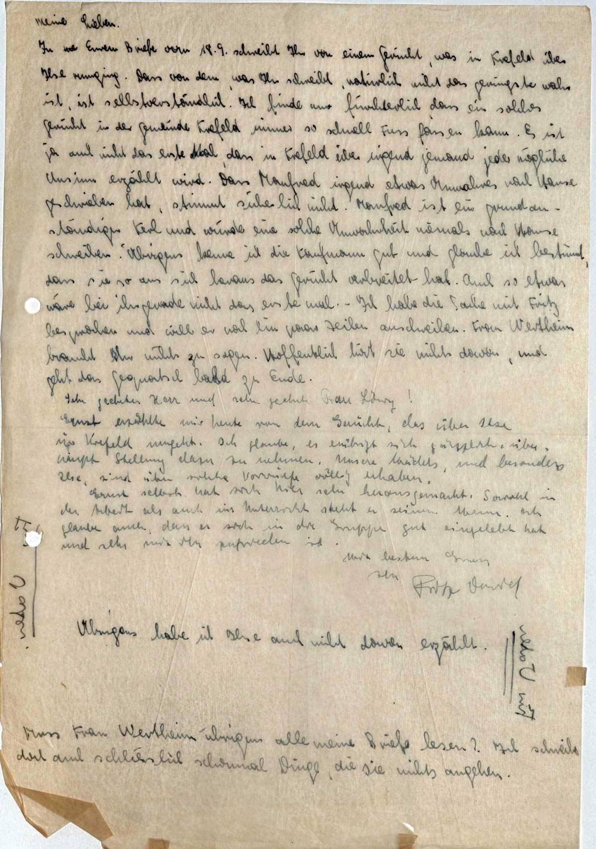 In Eurem Briefe vom 18.9. schreibt Ihr von einem Gerücht, was in Krefeld über Ilse rumging. Dass von dem, was Ihr schreibt, natürlich nicht das geringste wahr ist, ist selbstverständlich. Ich finde nur fürchterlich, dass ein solches Gerücht in der Gemeinde Krefeld immer so schnell Fuss fassen kann. Es ist ja auch nicht das erste Mal, dass in Krefeld über irgend jemand jeder mögliche Unsinn erzählt wird. Dass Manfred irgend etwas Unwahres nach Hause geschrieben hat, stimmt sicherlich nicht. Manfred ist ein grundanständiger Kerl und würde eine solche Unwahrheit niemals nach Hause schreiben. Übrigens kenne ich die Kaufmann gut und glaube ich bestimmt, dass sie so aus sich heraus das Gerücht verbreitet hat. Auch so etwas wäre bei ihr gerade nicht das erste Mal. - Ich habe die Sache mit Fritz besprochen und will er noch ein paar Zeilen anschreiben. Frau Wertheim braucht Ihr nichts zu sagen. Hoffentlich hört sie nichts davon, und geht das Gequatsche bald zu Ende.