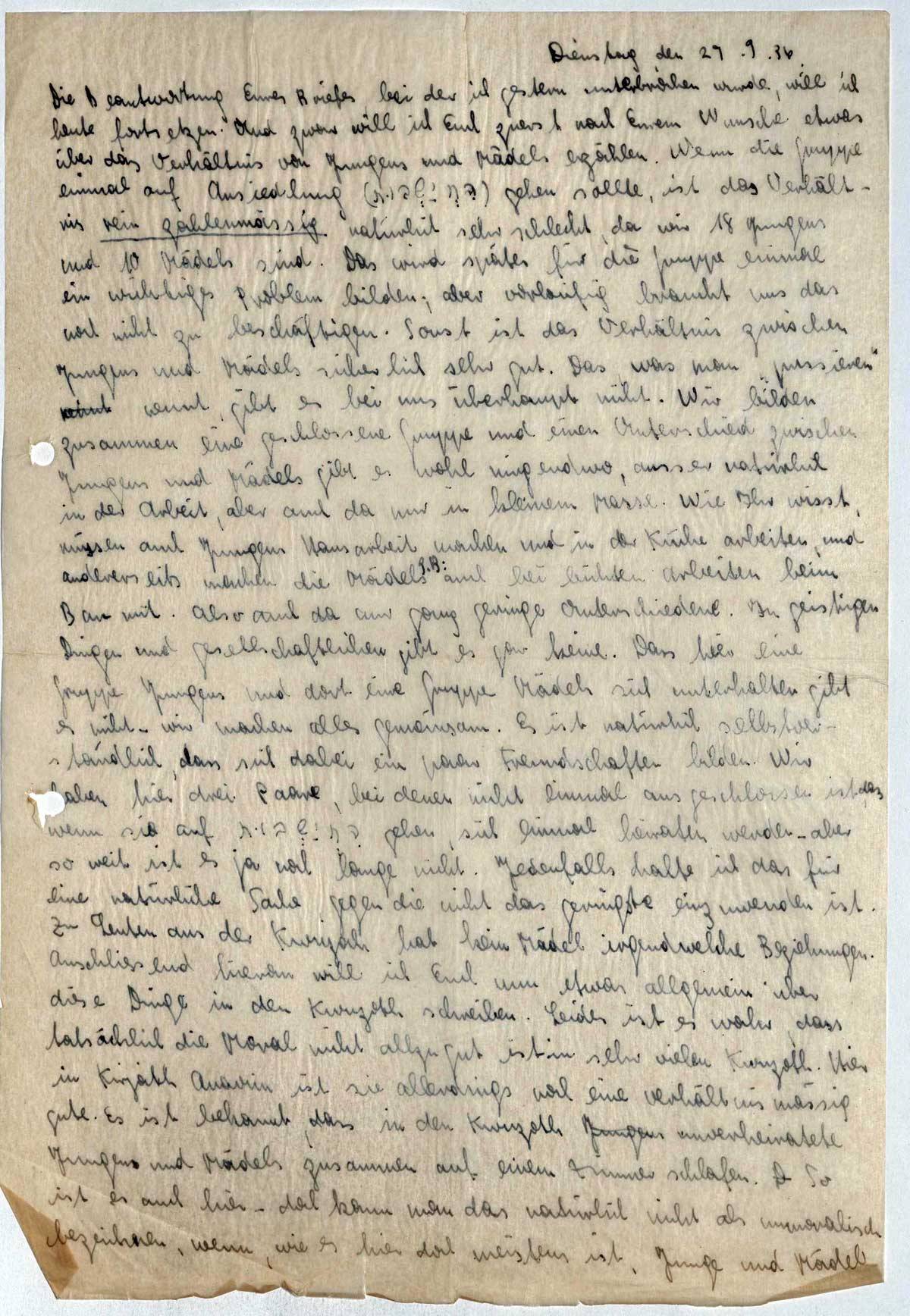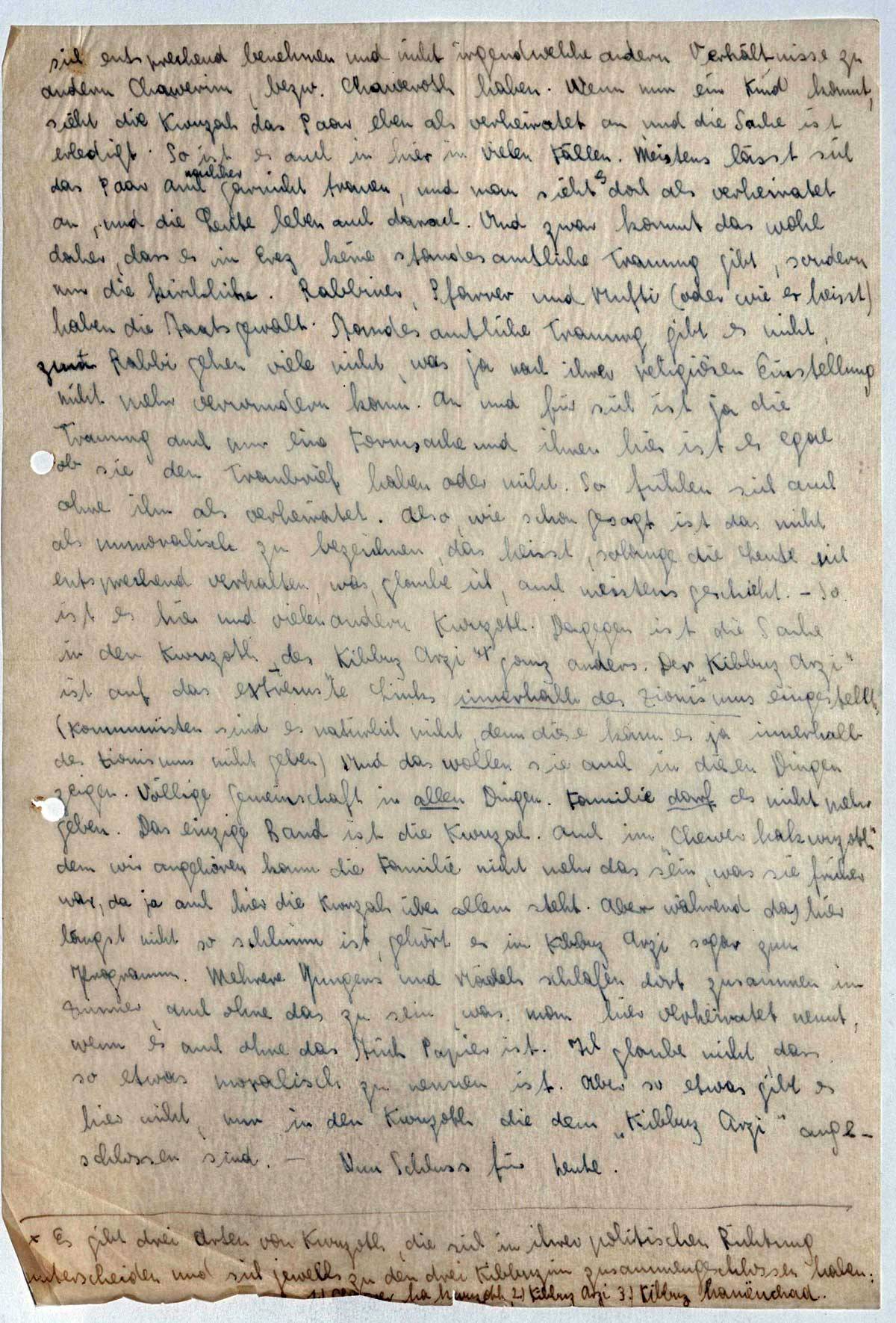 sich entsprechend benehmen und nicht irgendwelche andern Verhältnisse zu andern Chawerim, bezw. Chaweroth, haben. Wenn nun ein Kind kommt, sieht die Kwuzah das Paar eben als verheiratet an, und die Sache ist erledigt. So ist es auch hier in vielen Fällen. Meistens lässt sich das Paar auch nachher gar nicht trauen, und man sieht es doch als verheiratet an, und die Leute leben auch danach. Und zwar kommt das wohl daher, daß es in Erez keine standesamtliche Trauung gibt, sondern nur die kirchliche. Rabbiner, Pfarrer und Mufti (oder wie er heisst) haben die Staatsgewalt. Standesamtliche Trauung gibt es nicht, zum Rabbi gehen viele nicht, was ja nach ihrer religiösen Einstellung nicht mehr verwundern kann. An und für sich ist ja die Trauung auch nur eine Formsache und ihnen hier ist es egal, ob sie den Traubrief haben oder nicht. Sie fühlen sich auch ohne ihn als verheiratet. Also, wie schon gesagt, ist das nicht als unmoralisch zu bezeichnen, das heisst, solange die Leute sich entsprechend verhalten, was, glaube ich, auch meistens geschieht. - So ist es hier und vielen ändern Kwuzoth. Dagegen ist die Sache in den Kwuzoth des „Kibbuz Arzi“ ganz anders. Es gibt drei Arten von Kwuzoth, die sich in ihrer politischen Richtung unterscheiden und sich jeweils zu den drei Kibbuzbewegungen zusammengeschlossen haben: 1. Chewer Hakwuzoth, 2. Kibbuz Arzi, 3. Kibbuz Hameuchad. Der „Kibbuz Arzi” ist auf das extremste Links innerhalb des Zionismus eingestellt (Kommunisten sind es natürlich nicht, denn diese kann es ja innerhalb des Zionismus nicht geben). Und das wollen sie auch in diesen Dingen zeigen. Völlige Gemeinschaft in allen Dingen. Familie darf es nicht mehr geben. Das einzige Band ist die Kwuzah. Auch im „Chewer Hakwuzoth“, dem wir angehören, kann die Familie nicht mehr das sein, was sie früher war, da ja auch hier die Kwuzah über allem steht. Aber während das hier längst nicht so schlimm ist, gehört es im „Kibbuz Arzi“ sogar zum Programm. Mehrere Jungens und Mädels schlafen dort zusammen im Zimmer, auch ohne das zu sein, was man hier verheiratet nennt, wenn es auch ohne das Stück Papier ist. Ich glaube nicht, dass so etwas moralisch zu nennen ist. Aber so etwas gibt es hier nicht, nur in den Kwuzoth, die dem „Kibbuz Arzi“ angeschlossen sind. - Nun Schluß für heute.