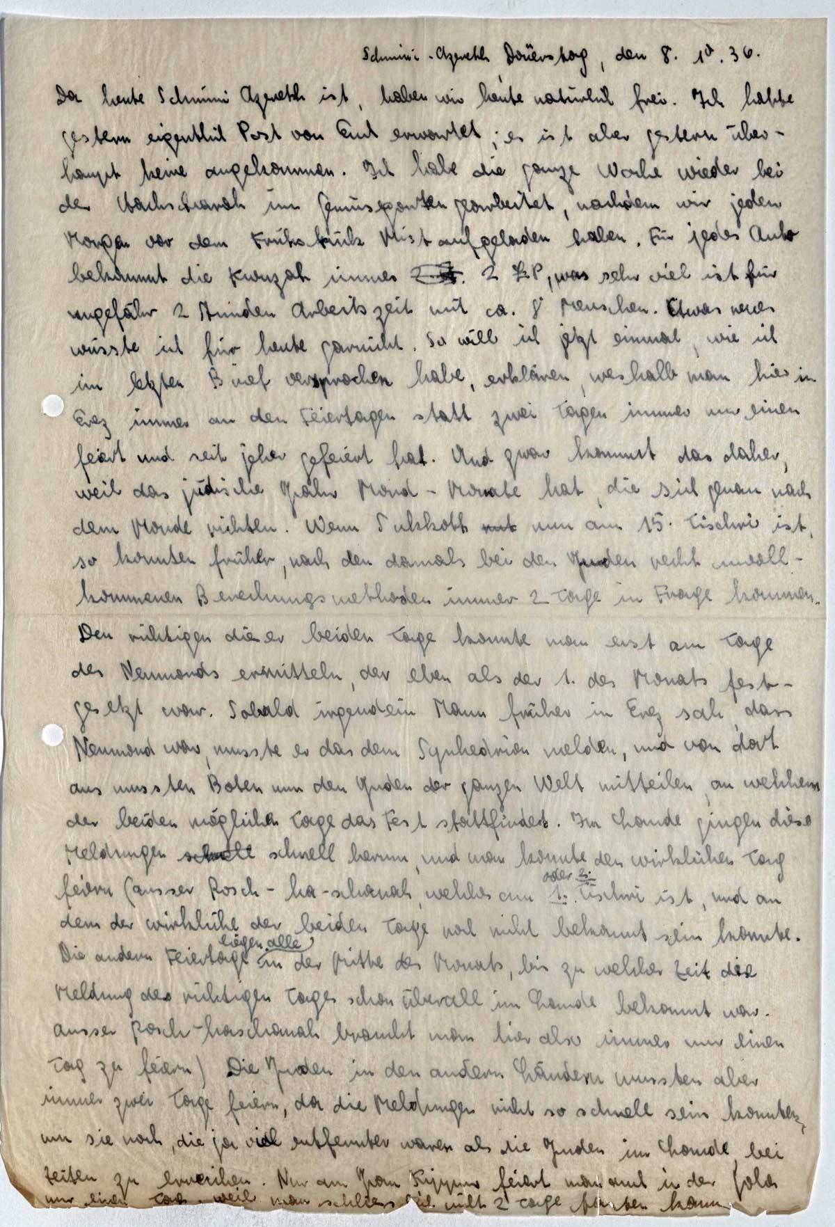 Da heute Schmini Azereth ist, haben wir heute natürlich frei. Ich hatte gestern eigentlich Post von Euch erwartet; es ist aber gestern überhaupt keine angekommen. Ich habe die ganze Woche wieder bei der Hachscharah im Gemüsegarten gearbeitet, nachdem wir jeden Morgen vor dem Frühstück Mist aufgeladen haben. Für jedes Auto bekommt die Kwuzah immer 2 ₤P, was sehr viel ist für ungefähr 2 Stunden Arbeitszeit mit ca. 8 Menschen. Etwas neues wüsste ich für heute garnicht. So will ich jetzt einmal, wie ich im letzten Brief versprochen habe, erklären, weshalb man hier in Erez immer an den Feiertagen statt zwei Tagen immer nur einen feiert und seit jeher gefeiert hat. Und zwar kommt das daher, weil das jüdische Jahr Mond-Monate hat, die sich genau nach dem Monde richten. Wenn Sukkoth nun am 15. Tischri ist, so konnten früher, nach den damals bei den Juden recht unvollkommenden Berechnungsmethoden immer 2 Tage in Frage kommen. Den richtigen dieser beiden Tage konnte man erst am Tage des Neumonds ermitteln, der eben als der 1. des Monats festgesetzt war. Sobald irgendein Mann früher in Erez sah, dass Neumond war, musste er das dem Synhedrion melden, und von dort aus mussten Boten nun den Juden der ganzen Welt mitteilen, an welchem der beiden möglichen Tage das Fest stattfindet. Im Lande gingen diese Meldungen schnell herum, und man konnte den wirklichen Tag feiern (ausser Rosch-ha-schanah, welches am 1. oder 2. Tischri ist, und an dem der wirkliche der beiden Tage noch nicht bekannt sein konnte. Die andern Feiertage liegen alle in der Mitte des Monats, bis zu welcher Zeit die Meldung des richtigen Tages schon überall im Lande bekannt war. Ausser Rosch-haschanah braucht man hier also immer nur einen Tag zu feiern). Die Juden in den andern Ländern mussten aber immer zwei Tage feiern, da die Meldungen nicht so schnell sein konnten, um sie noch, die ja viel entfernter waren als die Juden im Lande, bei Zeiten zu erreichen. Nur am Jom Kippur feiert man auch in der Gola nur einen Tag, weil man schliesslich nicht 2 Tage fasten kann.