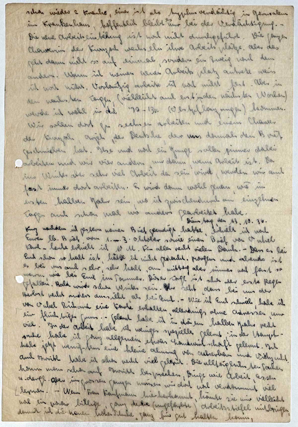 Kurz nachdem ich gestern meinen Brief geendigt hatte, erhielt ich noch Euren lb. Brief vom 1.-3. Oktober sowie einen Brief von Onkel Karl - heute erhielt ich 10 M. Für alles recht vielen Dank. - Dass es bei Euch schon so kalt ist, hätte ich nicht gedacht. Morgens und abends ist es bei uns auch sehr, sehr kalt, am Mittag aber immer noch fast so warm, wie bei Euch im Sommer. Dieser Tage ist schon der erste Regen gefallen. Bald wird schon Winter sein. Ihr seht, dass bei uns der Herbst recht anders aussieht, als bei Euch. - Wie ich Euch schrieb, habe ich von Onkel Richard eine Karte erhalten, allerdings ohne Adressen, nur ein flüchtiger Gruss. - Gelernt habe ich in diesem halben Jahr recht viel. In der Arbeit habe ich weniger spezielles gelernt; in der Hauptsache habe ich ganz allgemein etwas Landwirtschaft gelernt. Ich habe jetzt wenigstens eine kleine Ahnung von Ackerbau und Viehzucht. Auch Iwrith habe ich schon recht viel gelernt. Die alltäglichsten Sachen kann man schon auf Iwrith besprechen, Dinge wie Arbeit, Essen u. dergl. Aber im grossen ganzen müssen wir doch noch verdammt viel lernen. - Wenn Frau Kaufmann hierherkommt, könnte sie mir vielleicht noch ein paar billige, ganz derbe (ungefärbte) Arbeitsstiefel mitbringen, damit ich die neuen hohen Schuhe ganz für gut behalten kann.