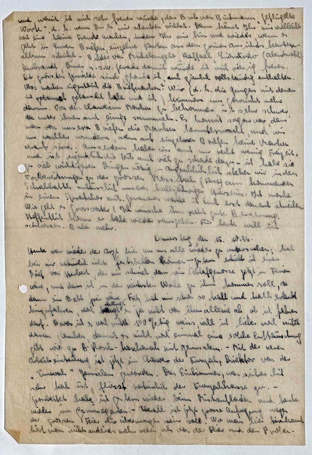 und, womit ich mich sehr freuen würde, das Buch von Büchmann „Geflügelte Worte”, d. h. wenn Du es mir schenken willst. Dann könnt Ihr mir vielleicht noch eine kleine Freude machen, indem Ihr mir hin und wieder, wenn es geht in Euren Briefen, einzelne Karten aus dem grünen Ansichtskartenalbum schickt - Bilder von Michelangelo, Raffael, Leonardo (Abendmahl), Rembrandt, Dürer u.s.w. Gerade damit würde ich mich riesig freuen. Die grössten Gemälde sind, glaube ich, auch ziemlich vollständig enthalten. Was machen eigentlich die Briefmarken? Wir (d. h. die Jungens mit denen ich getauscht habe und ich) kümmern uns garnicht mehr darum. Von den Chawerim Marken zu bekommen, ist sehr schwer, da unter ihnen auch einige sammeln. Es kommt sogar vor, dass man von unsern Briefen die Marken heruntermacht, und wir uns nachher wundern, wenn auf einzelnen Briefen keine Marken drauf sind. Ausserdem haben wir auch nur recht wenig Freizeit, und ist eigentlich die Zeit auch viel zu schade dazu - ich habe sie zu viel wichtigeren Dingen nötig. - Augenblicklich stehen wir in den Vorbereitungen zu der grossen Messibah (Fest) am kommenden Schabbath anlässlich unseres halbjährigen Hierseins. Ich mache in einem Sprechchor mit. Genaueres werde ich Euch erst danach schreiben. Wie geht es Grossvater? Ich wünsche ihm recht gute Besserung. Hoffentlich kann er bald wieder rausgehen. Für heute will ich schliessen. Bald mehr.