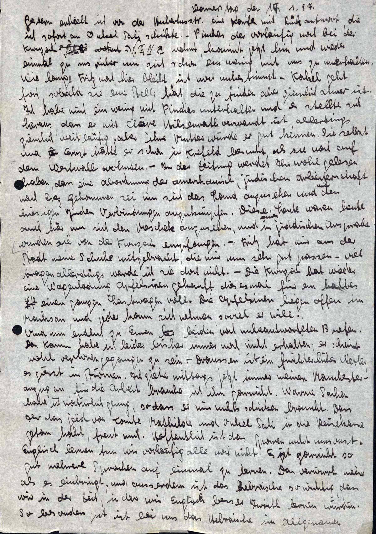 Gestern erhielt ich von der Hubertusstr. eine Karte mit Rückantwort, die ich sofort an Onkel Sali schickte. - Pinchas, der vorläufig noch bei der Kwuzah [..] wohnt, kommt jetzt hin und wieder einmal zu uns rüber um sich schon ein wenig mit uns zu unterhalten. Wie lange Fritz noch hier bleibt, ist noch unbestimmt. - Kakel geht fort, sobald sie eine Stelle hat, die zu finden aber ziemlich schwer ist. Ich habe mich ein wenig mit Pinchas unterhalten und es stellte sich heraus, dass er mit Cläre Hilsenrath verwandt ist, allerdings ziemlich weitläufig; aber ihre Mutter würde er gut kennen. Sie selbst und Ernst hätte er schon in Krefeld besucht, als sie noch auf dem Westwall wohnten. - In der Zeitung werdet Ihr wohl gelesen haben, dass eine Abordnung der amerikanisch, jüdischen Arbeiterschaft nach Erez gekommen sei, um sich das Land anzusehen und mit den hiesigen Juden Verbindungen anzuknüpfen. Diese Leute waren heute auch hier, um sich den [..] anzusehen, und in jiddischer Ansprache wurden sie von der Kwuzah empfangen. - Fritz hat mir aus der Stadt meine Schuhe mitgebracht, die mir nun sehr gut passen - viel tragen allerdings werde ich sie doch nicht. - Die Kwuzah hat wieder eine Wagenladung Apfelsinen gekauft, diesesmal für ein halbes ₤P. einen ganzen Lastwagen voll. Die Apfelsinen liegen offen im Machsan, und jeder kann sich nehmen, soviel er will.
