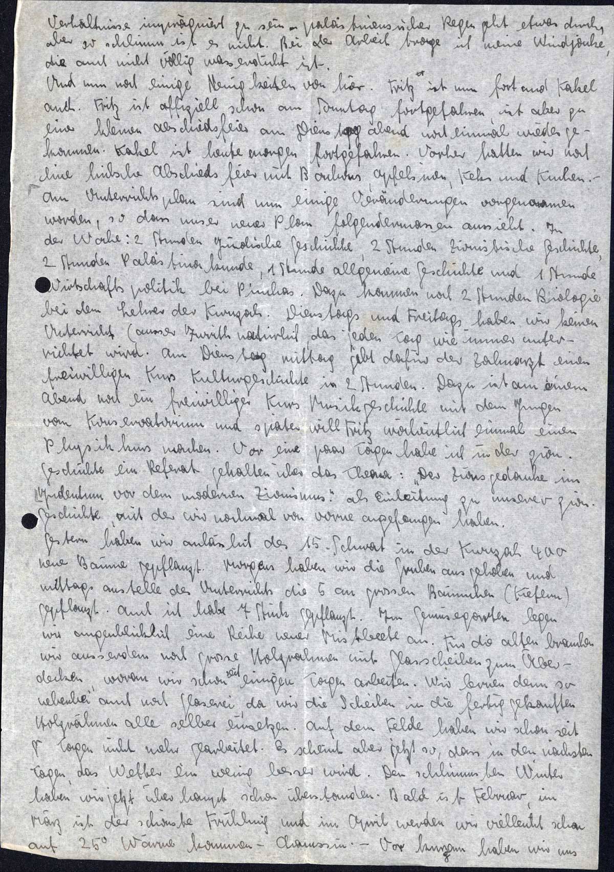 Und nun noch einige Neuigkeiten von hier. Fritz ist nun fort und Kakel auch. Fritz ist offiziell schon am Sonntag fortgefahren, ist aber zu einer kleinen Abschiedsfeier am Dienstagabend noch einmal wiedergekommen. Kakel ist heute morgen fortgefahren. Vorher hatten wir noch eine hübsche Abschiedsfeier mit Bonbons, Apfelsinen, Keks und Kuchen. - Am Unterrichtsplan sind nun einige Veränderungen vorgenommen worden, so dass unser neuer Plan folgendermassen aussieht. In der Woche: 2 Stunden Jüdische Geschichte, 2 Stunden Zionistische Geschichte, 2 Stunden Palästinakunde, 1 Stunde allgemeine Geschichte und 1 Stunde Wirtschaftspolitik bei Pinchas. Dazu kommen noch 2 Stunden Biologie bei dem Lehrer der Kwuzah. Dienstags und Freitags haben wir keinen Unterricht (ausser Iwrith natürlich, das jeden Tag wie immer unterrichtet wird. Am Dienstag mittag gibt dafür der Zahnarzt einen freiwilligen Kurs Kulturgeschichte in 2 Stunden. Dazu ist an einem Abend noch ein freiwilliger Kurs Musikgeschichte mit dem Jungen vom Konservatorium und später will Fritz wöchentlich einmal einen Physikkurs machen. Vor ein paar Tagen habe ich in der zion. Geschichte ein Referat gehalten über das Thema: „Der Zionsgedanke im Judentum vor dem modernen Zionismus” als Einleitung zu unserer zion. Geschichte, mit der wir nochmal von vorne angefangen haben.