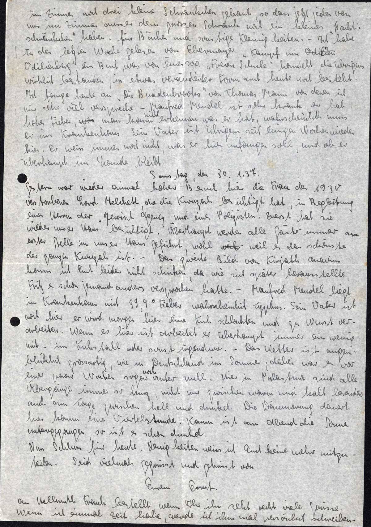 Ich erhielt heute einen Brief aus Eindthoven, mit dem ich mich sehr gefreut habe. Ich werde demnächst einmal ein paar Zeilen an Polahs einlegen. Du, lb. Mutter, stellst in Deinem Brief noch einige Fragen, die ich noch beantworten will. Dr. Hirsch aus Jerusalem ist Arzt, ich glaube am Hadassahkrankenhaus. - Die Änderung an meinen Schuhen habe ich selbst bezahlt, es hat nur 6 Piaster gekostet. - Ich trage hier nur meinen Lederolmantel, der aber leider nicht viel taugt; er scheint nur für deutsche