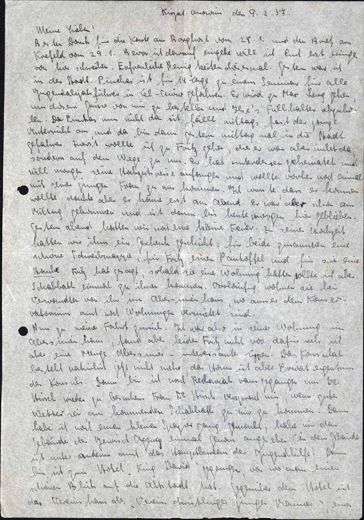 Besten Dank für die Karte aus Borghorst vom 28.1. und den Brief aus Krefeld vom 29.1. Bevor ich darauf eingehe, will ich Euch erst einiges von hier schreiben. Erfreuliche Neuigkeiten diesmal. Gestern war ich in der Stadt. Pinchas ist für 14 Tage zu einem Seminar für alle Jugendalijahführer in Tel-Aviv gefahren. Er wird zu Max Lang gehen, um diesem Grüsse von mir zu bestellen und Ilse's Füllhalter abzuholen. Da Pinchas nun nicht da ist, fällt mittags fast der ganze Unterricht aus, und da bin dann gestern mittag mal in die Stadt gefahren. Zuerst wollte ich zu Fritz gehen, dieser war aber nicht dan, sondern auf dem Wege zu uns. Er hat unterdessen geheiratet und will morgen seine Hochzeitsreise anfangen und wollte vorher noch einmal mit seiner jungen Frau zu uns kommen. Ich wusste, dass er kommen wollte, dachte aber er käme erst am Abend. Er war aber schon am Mittag gekommen und ist dann bis heute morgen hier geblieben. Gestern abend hatten wir noch eine kleine Feier. Zu seiner Hochzeit hatten wir ihm ein Geschenk geschickt: für beide zusammen eine schöne Schreibmappe, für Fritz einen Pantoffel und für sie eine Haube. Fritz hat gesagt, sobald sie eine Wohnung hätten, sollte ich über Schabbath einmal zu ihnen kommen. Vorläufig wohnen sie bei Verwandten von ihr im Abessinienhaus, wo ausser dem Konservatorium auch noch Wohnungen vermietet sind.