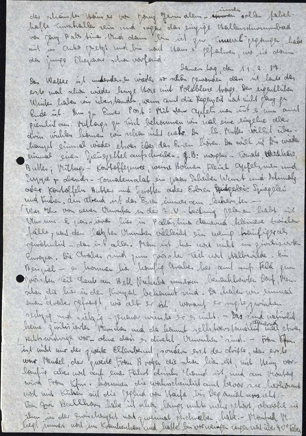 Was Ihr von neuen Unruhen in der Z.V.-Zeitung gelesen habt, ist Unsinn. Es passieren hier in Palästina dauernd kleinere Zwischenfälle; nach den letzten Unruhen vielleicht ein wenig häufiger als gewöhnlich - das ist alles. Man ist hier noch nicht im zivilisierten Europa. Die Araber sind zum größten Teil noch Halbwilde. Ein Beispiel - es kommen hier häufig Araber her, auch aufs Feld, zum grössten Teil Leute aus Beth Nakuba, unserm benachbarten Dorf, Menschen, die hier in der Kwuzah bekannt sind. Da haben wir einmal einen Araber gefragt, wie alt er ist, worauf er sagte, zwischen sechzig und siebzig - genauer wüsste er es nicht. - Das sind natürlich keine zivilisierten Menschen, und da kommt selbstverständlich dauernd mal etwas Rechtswidriges vor - ohne dass es direkt „Unruhen“ sind. - Frau Kfm. ist nicht nur der zweite Elternbesuch, sondern erst der dritte; der erste war Mendel, der zweite Frau Brotzen, die schon hier ist, mit Heinz vorläufig aber noch auf einer Fahrt durchs Land ist, und am Montag wird Frau Kfm. kommen, die wahrscheinlich auch bevor sie herkommt noch mit Küken sich die Gegend von Haifa bis Deganiah ansieht. - Von Zvi Ballhorn habe ich schon lange nichts mehr gehört, obwohl ich ihm in der Zwischenzeit noch zweimal geschrieben habe. - Manfred M. liegt immer noch im Krankenhaus und hatte bis vor wenigen Tagen noch über 40° Fieber.