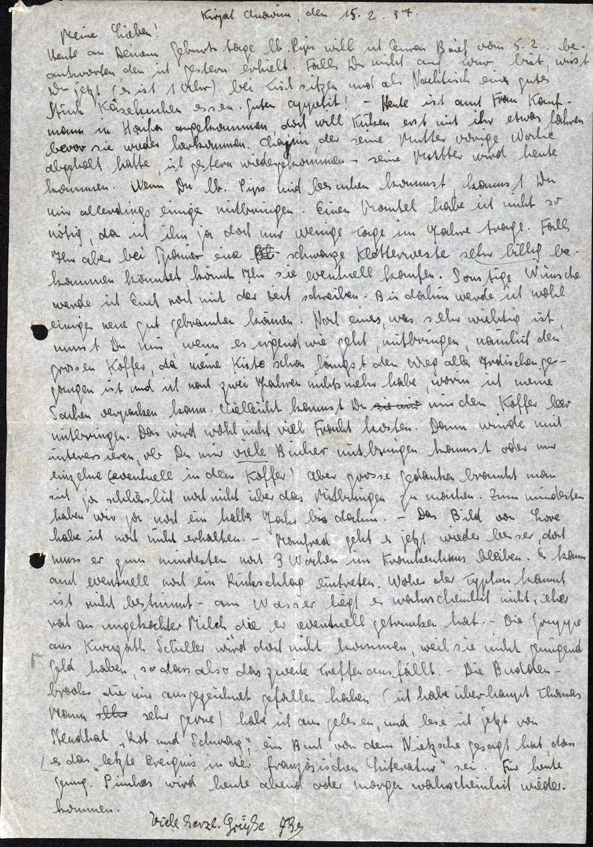 Heute an Deinem Geburtstage lb. Pips will ich Euren Brief vom 5.2. beantworten, den ich gestern erhielt. Falls Du nicht auf Tour bist, wirst Du jetzt (es ist 1 Uhr) bei Tisch sitzen und als Nachtisch ein gutes Stück Käsekuchen essen. Guten Appetit! - Heute ist auch Frau Kaufmann in Haifa angekommen, doch will Küken erst mit ihr etwas fahren, bevor sie wieder herkommen. Chajim, der seine Mutter vorige Woche abgeholt hatte, ist gestern wiedergekommen - seine Mutter wird heute kommen. Wenn Du lb. Pips mich besuchen kommst, kannst Du mir allerdings einiges mitbringen. Einen Mantel habe ich nicht so nötig, da ich ihn ja doch nur wenige Tage im Jahre trage. Falls Ihr aber bei Spanier eine schwarze Kletterweste sehr billig bekommen könntest, könnt Ihr sie eventuell kaufen. Sonstige Wünsche werde ich Euch noch mit der Zeit schreiben. Bis dahin werde ich wohl einiges neue gut gebrauchen können. Noch eines, was sehr wichtig ist, musst Du mir, wenn es irgendwie geht, mitbringen, nämlich den grossen Koffer, da meine Kiste schon längst den Weg alles Irdischen gegangen ist und ich nach zwei Jahren nichts mehr habe, worin ich meine Sachen verpacken kann. Vielleicht kannst Du mir den Koffer leer mitbringen. Das wird wohl nicht viel Fracht kosten. Dann würde mich interessieren, ob Du mir viele Bücher mitbringen kannst oder nur einzelne (eventuell in dem Koffer). Aber grosse Gedanken braucht man sich ja schliesslich noch nicht über das Mitbringen zu machen. Zum mindesten haben wir ja noch ein halbes Jahr bis dahin. - Das Bild von Lore habe ich noch nicht erhalten. - Manfred geht es jetzt wieder besser, doch muss er zum mindesten noch 3 Wochen im Krankenhaus bleiben. Es kann auch eventuell noch ein Rückschlag eintreten. Woher der Typhus kommt, ist nicht bestimmt - am Wasser liegt es wahrscheinlich nicht, eher noch an ungekochter Milch, die er eventuell getrunken hat. - Die Gruppe aus Kwuzath Schiller wird doch nicht kommen, weil sie nicht genügend Geld haben, so dass also das zweite Treffen ausfällt. - Die Buddenbrooks, die mir ausgezeichnet gefallen haben (ich habe überhaupt Thomas Mann sehr gerne), habe ich ausgelesen, und lese ich jetzt von Stendhal „Rot und Schwarz“, ein Buch, von dem Nietzsche gesagt hat, dass es das „letzte Ereignis in der französischen Literatur“ sei. Für heute genug. Pinchas wird heute abend oder morgen wahrscheinlich wiederkommen.