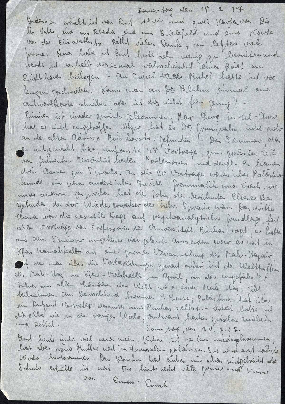 Pinchas ist wieder zurückgekommen; Max Levy in Tel-Aviv hat er nicht angetroffen, bezw. hat er Dr. Grinspahn nicht mehr an der alten Adresse Pinskerstr. gefunden. - Das Seminar, das er mitgemacht hat, umfasste 48 Vorträge, zum grössten Teil von führenden Persönlichkeiten, Professoren und dergl. Es kamen drei Themen zur Sprache. An die 20 Vorträge waren über Palästinakunde, ein paar andere über Iwrith- Grammatik und Tenach, wo unter anderm gesprochen hat der Sohn des berühmten Elieser Ben Yehuda, der der Wiedererwecker der hebr. Sprache war. Das dritte Thema war die sexuelle Frage auf psychoanalytischer Grundlage; fast alles Vorträge von Professoren der Universität. Pinchas sagt, er hätte auf dem Seminar ungeheuer viel gelernt. Ausserdem war er noch in Kfar Hamakkabi auf einer grossen Versammlung des Mak-Hazair, auf der man über die Vorbereitungen sprach anlässlich des Welttreffens des Mak-Haz. in Kfar Makkabi im April, an dem ungefähr 40 Führer aus allen Ländern der Welt, wo es einen Mak-Haz. gibt, teilnehmen. Aus Deutschland kommen 4 Leute; Palästina hat über ein Dutzend Vertreter, darunter auch Pinchas selbst. - Arbeit hatte ich dieselbe wie in der vorigen Woche; Unkraut hacken zwischen Zwiebeln und Rettich.