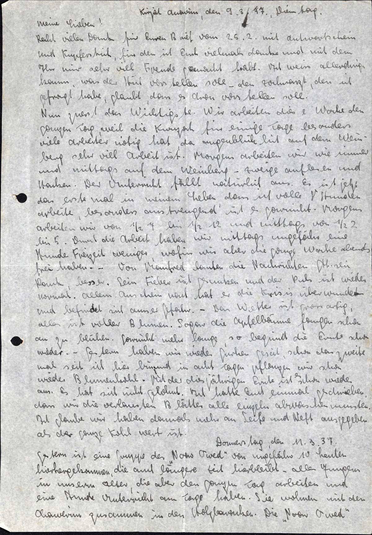 Nun zuerst das Wichtigste. Wir arbeiten diese Woche den ganzen Tag, weil die Kwuzah für einige Tage besonders viele Arbeiter nötig hat, da augenblicklich auf dem Weinberg sehr viel Arbeit ist. Morgens arbeiten wir wie immer und mittags auf dem Weinberg - Zweige auflesen und Hacken. Der Unterricht fällt natürlich aus. Es ist jetzt das erste Mal in meinem Leben, dass ich volle 8 Stunden arbeite, besonders anstrengend ist es garnicht. Morgens arbeiten wir von ½ 7 bis ½ 12 und mittags von ½ 2 bis 5. Durch die Arbeit haben wir mittags ungefähr eine Stunde Freizeit weniger, wofür wir aber die ganze Woche abends frei haben. - Von Manfred lauten die Nachrichten Gtt. sei Dank, besser. Sein Fieber ist gesunken und der Puls ist wieder normal. Allem Anschein nach hat er die Krisis überwunden und befindet sich ausser Gefahr. - Das Wetter ist grossartig, alles ist voller Blumen. Sogar die Apfelbäume fangen schon an zu blühen. Garnicht mehr lange, so beginnt die Ernte schon wieder. - Gestern haben wir wieder Gurken gesät, schon das zweite Mal seit ich hier bin, und in acht Tagen pflanzen wir schon wieder Blumenkohl. Mit der diesjährigen Ernte ist es schon wieder aus. Es hat sich nicht gelohnt. Ich hatte Euch einmal geschrieben, dass wir die verlausten Blätter alle einzeln abwaschen mussten. Ich glaube wir haben damals mehr an Seife und Neft ausgegeben als der ganze Kohl wert ist.