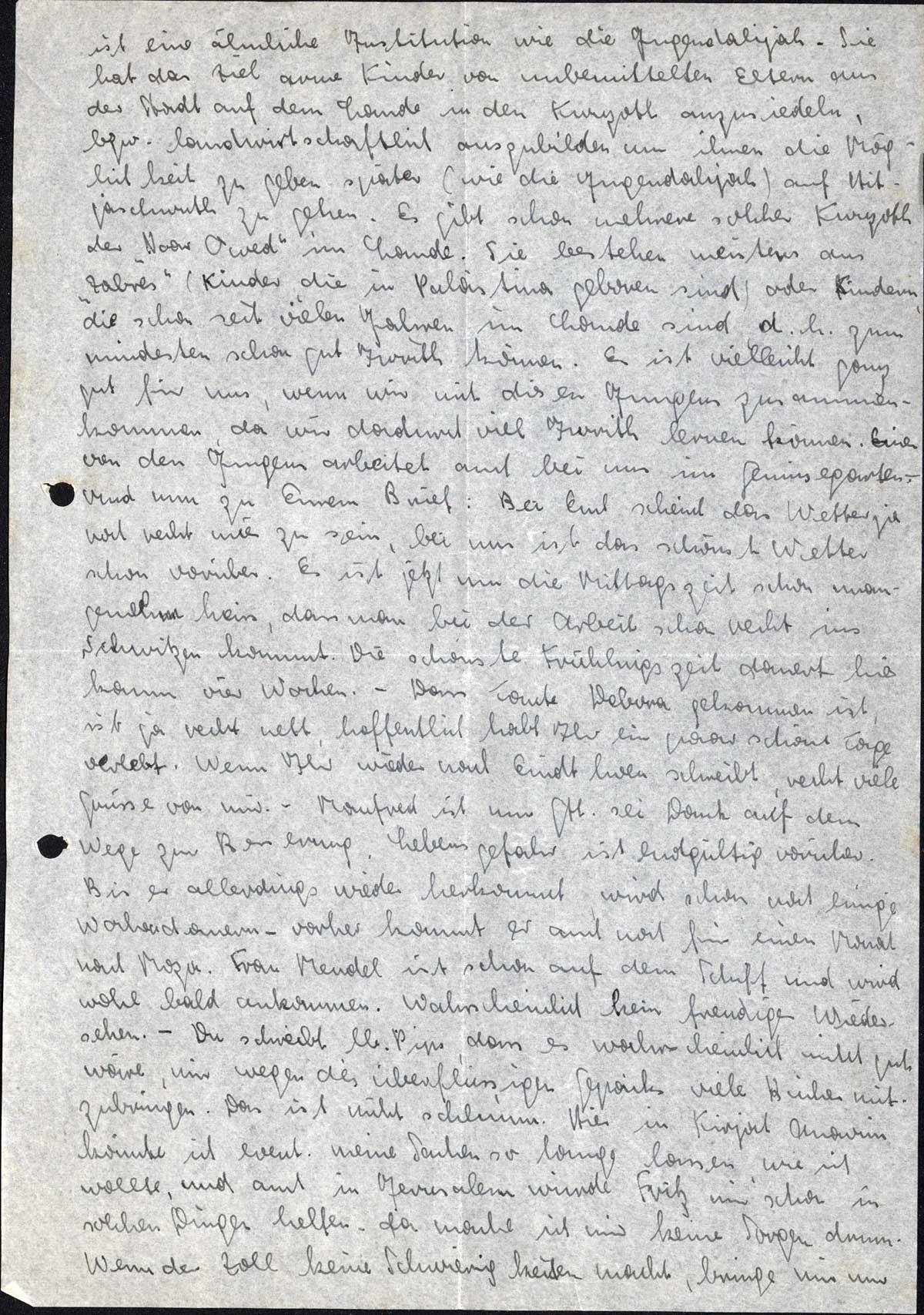 ist eine ähnliche Institution wie die Jugendalijah. Sie hat das Ziel arme Kinder von unbemittelten Eltern aus der Stadt auf dem lande in den Kwuzoth anzusiedeln, bezw. landwirtschaftlich auszubilden um ihnen die Möglichkeit zu geben, später (wie die Jugendalijah) auf Hitjaschwuth zu gehen. Es gibt schon mehrere solcher Kwuzoth der „Noar Owed” im Lande. Sie bestehen meistens aus „Zabres” (Kinder, die in Palästina geboren sind) oder Kindern, die schon seit vielen Jahren im Lande sind, d. h. zum mindesten schon gut Iwrith können. Es ist vielleicht ganz gut für uns, wenn wir mit diesen Jungen zusammenkommen, da wir dadurch viel Iwrith lernen können. Einer von den Jungen arbeitet auch bei uns im Gemüsegarten. - Und nun zu Eurem Brief: Bei Euch scheint das Wetter ja noch recht mies zu sein, bei uns ist das schönste Wetter schon vorüber. Es ist jetzt um die Mittagszeit schon unangenehm heiss, dass man bei der Arbeit schon recht ins Schwitzen kommt. Die schönste Frühlingszeit dauert hier kaum vier Wochen. - Dass Tante Debora gekommen ist, ist ja recht nett, hoffentlich habt Ihr ein paar schöne Tage verlebt. Wenn Ihr wieder nach Eindthoven schreibt, recht viele Grüsse von mir. - Manfred ist nun Gtt. sei Dank auf dem Wege zur Besserung. Lebensgefahr ist endgültig vorüber. Bis er allerdings wieder herkommt, wird schon noch einige Wochen dauern - vorher kommt er auch noch für einen Monat nach Moza. Frau Mendel ist schon auf dem Schiff und wird wohl bald ankommen. Wahrscheinlich kein freudiges Wiedersehen. - Du schreibst, lb. Pips, dass es wahrscheinlich nicht gut wäre, mir wegen des überflüssigen Gepäcks viele Bücher mitzubringen. Das ist nicht schlimm. Hier in Kirjat Anavim könnte ich event. meine Sachen so lange lassen, wie ich wollte, und auch in Jerusalem würde Fritz mir schon in solchen Dingen helfen - da mache ich mir keine Sorgen drum. Wenn der Zoll keine Schwierigkeiten macht, bringe mir nur
