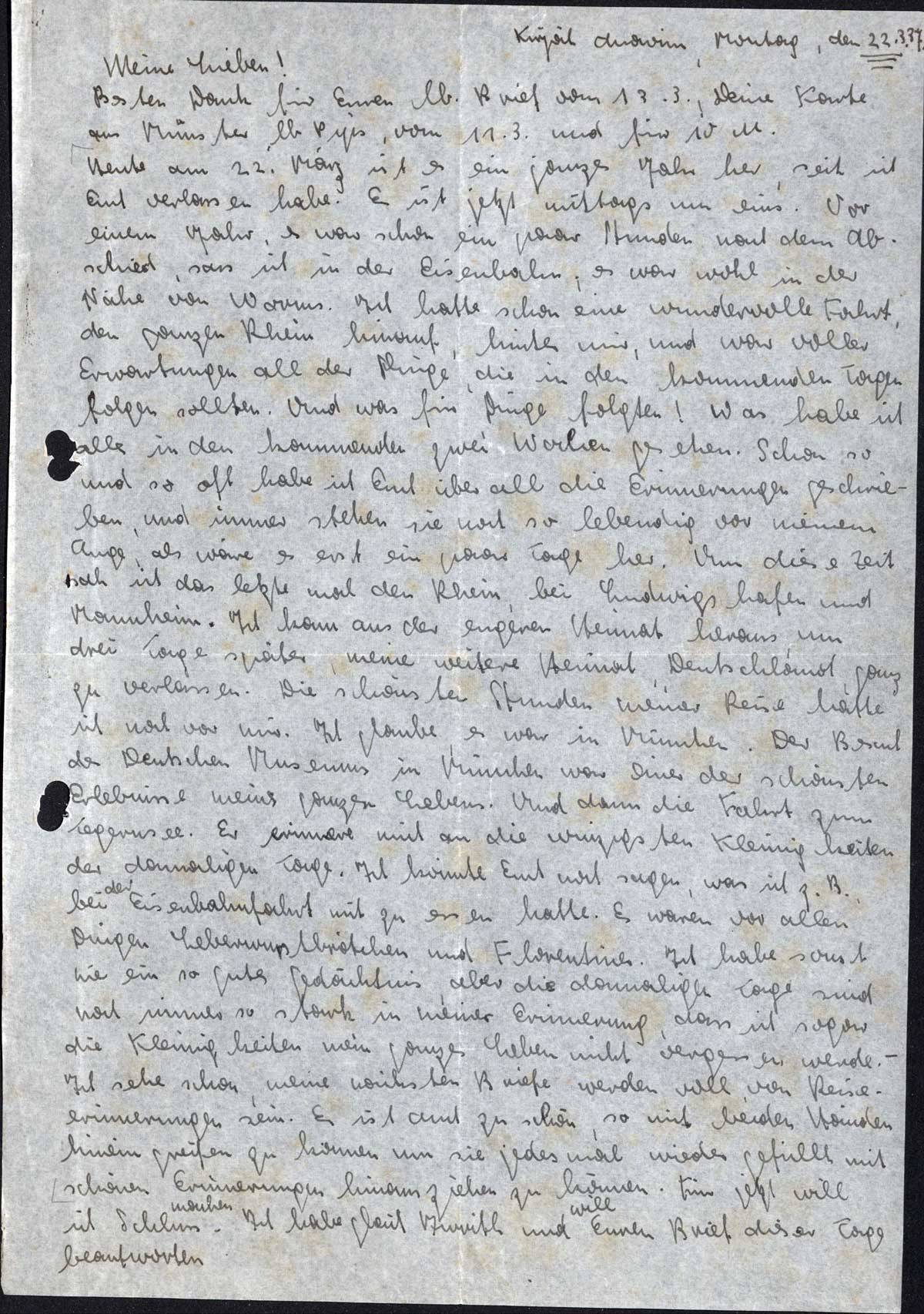 Heute am 22. März ist es ein ganzes Jahr her, seit ich Euch verlassen habe. Es ist jetzt mittags um eins. Vor einem jahr, es war schon ein paar Stunden nach dem Abschied, sass ich in der Eisenbahn; es war wohl in der Nähe von Worms. Ich hatte schon eine wundervolle Fahrt, den ganzen Rhein hinauf, hinter mir, und war voller Erwartungen all der Dinge, die in den kommenden Tagen folgen sollten. Und was für Dinge folgten! Was habe ich alles in den kommenden zwei Wochen gesehen. Schon so und so oft habe ich Euch über all die Erinnerungen geschrieben, und immer stehen sie noch so lebendig vor meinem Auge, als wäre es erst ein paar Tage her. Um diese Zeit sah ich das letzte Mal den Rhein, bei Ludwigshafen und Mannheim. Ich kam aus der engeren Heimat heraus, um drei Tage später, meine weitere Heimat, Deutschland, ganz zu verlassen. Die schönsten Stunden meiner Reise hatte ich noch vor mir. Ich glaube, es war in München. Der Besuch des Deutschen Museums in München war einer der schönsten Erlebnisse meines ganzen Lebens. Und dann die Fahrt zum Tegernsee. Ich erinnere mich an die winzigsten Kleinigkeiten der damaligen Tage. Ich könnte Euch noch sagen, was ich z. B. bei der Eisenbahnfahrt mit zu essen hatte. Es waren vor allen Dingen Leberwurstbrötchen und Florentiner. Ich habe sonst nie ein so gutes Gedächtnis, aber die damaligen Tage sind noch immer so stark in meiner Erinnerung, dass ich sogar die Kleinigkeiten mein ganzes Leben nicht vergessen werde. - Ich sehe schon, meine nächsten Briefe werden voll von Reiseerinnerungen sein. Es ist auch zu schön, so mit beiden Händen hineingreifen zu können um sie jedesmal wieder gefüllt mit schönen Erinnerungen hinausziehen zu können. Für jetzt will ich Schluss machen. Ich habe gleich Iwrith und will Euren Brief dieser Tage beantworten.