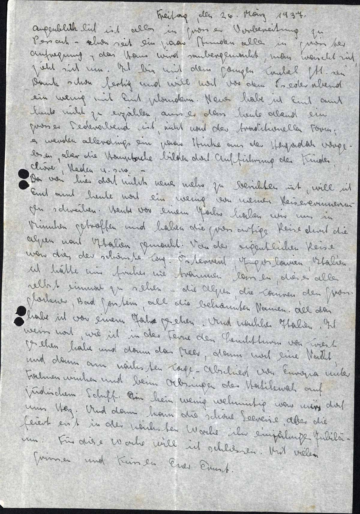 Da von hier doch nichts neues mehr zu berichten ist, will ich Euch auch heute noch ein wenig von meinen Reiseerinnerungen schreiben. Heute vor einem Jahr haben wir uns in München getroffen und haben die grossartige Reise durch die Alpen nach Italien gemacht. Von der eigentlichen Reise war dies der schönste Tag. Österreich, Jugoslawien, Italien, ich hätte mir früher nie träumen lassen, dieses alles selbst einmal zu sehen - die Alpen, die Tauern, den Grossglockner, Bad Gastein, all die bekannten Namen. All das habe ich vor einem Jahre gesehen. Und nachher Italien. Ich weiss noch, wie ich in der Ferne den Leuchtturm von Triest gesehen habe und dann das Meer, dann noch eine Nacht, und dann am nächsten Tage - Abschied von Europa unter Fahnenwinken und beim Absingen des Hatikwah auf jüdischem Schiff. Ein klein wenig wehmütig war mirs doch ums Herz. Und dann kam die schöne Seereise, aber die feiert erst in der nächsten Woche ihr einjähriges Jubiläum. Für diese Woche will ich schliessen. Mit vielen Grüssen und Küssen