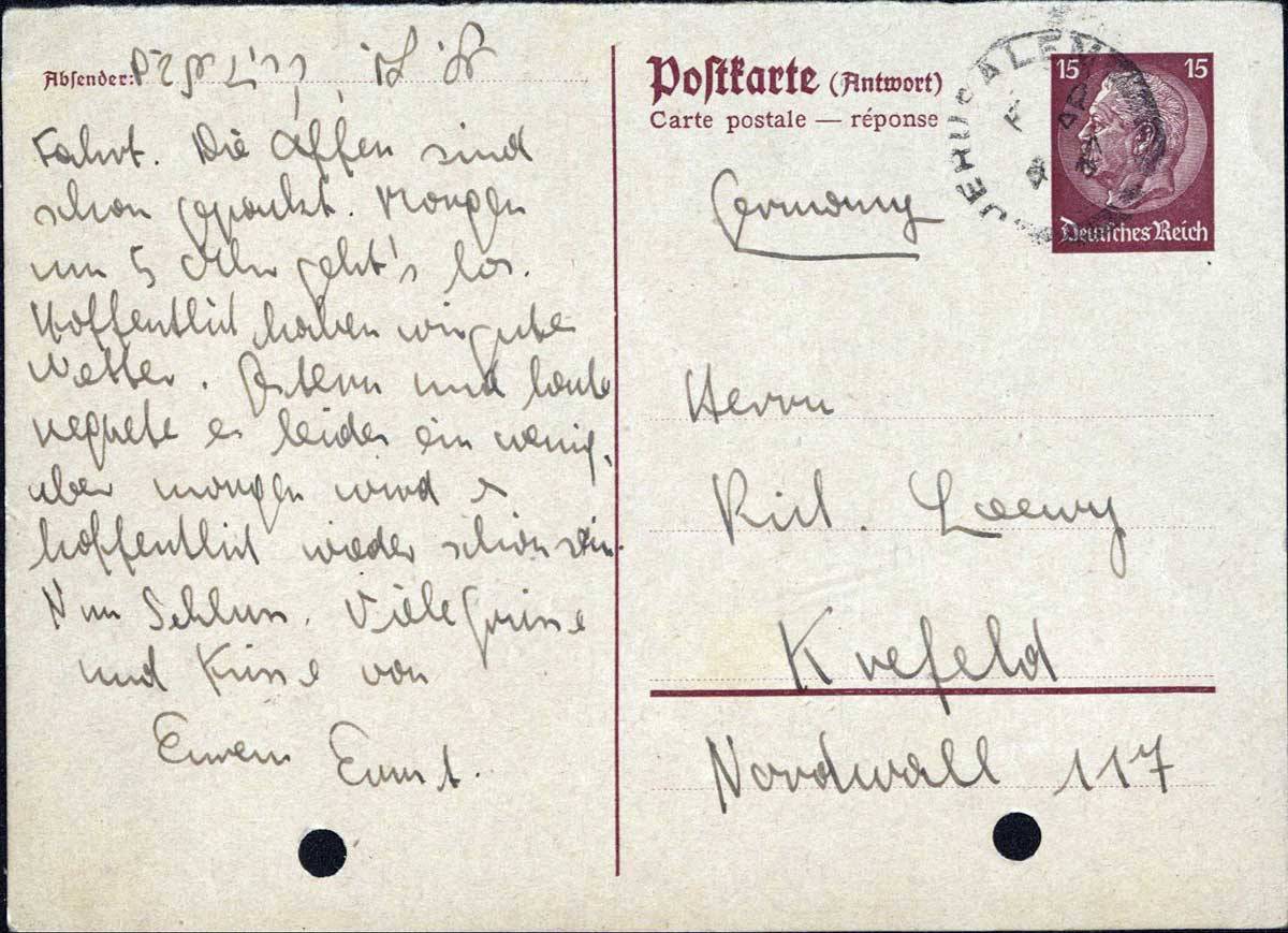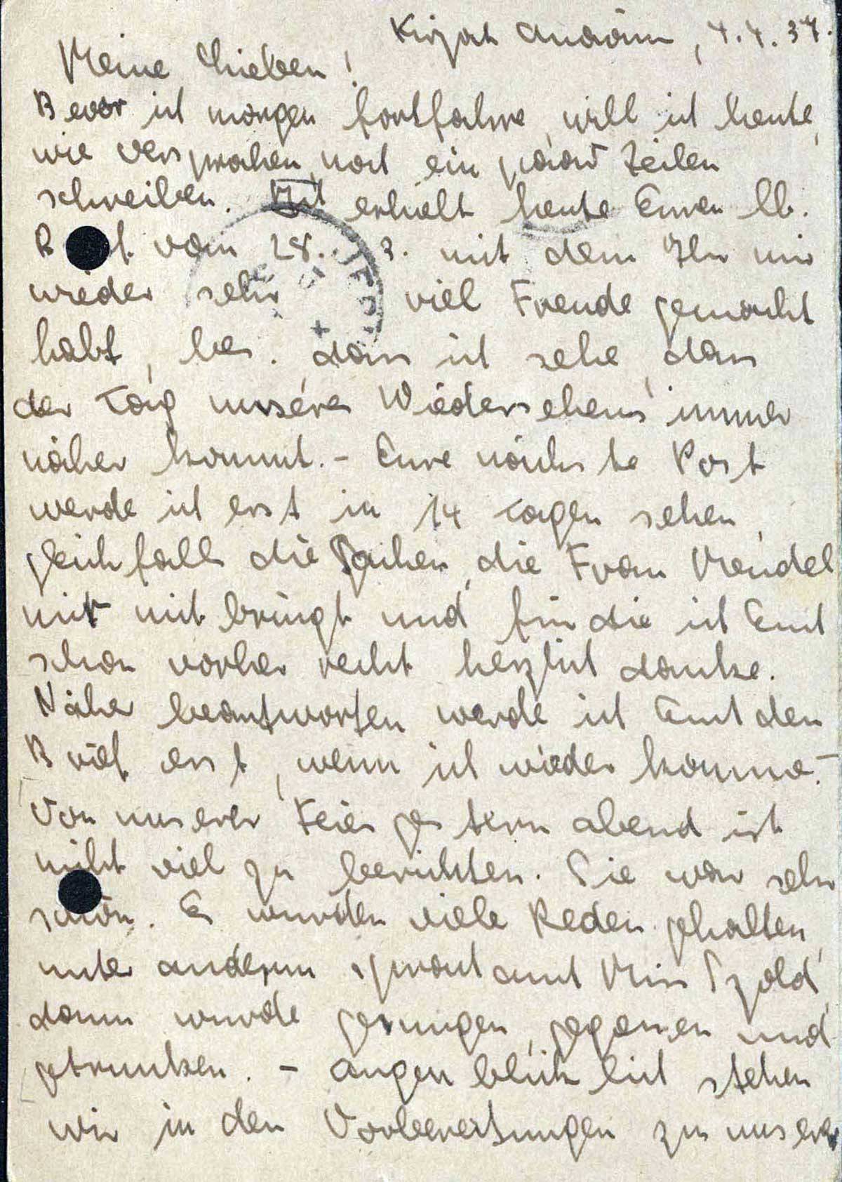 Bevor ich morgen fortfahre, will ich heute, wie versprochen, noch ein paar Zeilen schreiben. Ich erhielt heute Euren lb. Brief vom 28.3. mit dem Ihr mir wieder sehr viel Freude gemacht habt, bes., dass ich sehe, dass der Tag unseres Wiedersehens immer näher kommt. - Eure nächste Post werde ich erst in 14 Tagen sehen, gleichfalls die Sachen, die Frau Mendel mir mitbringt und für die ich Euch schon vorher recht herzlich danke. Näher beantworten werde ich Euch den Brief erst, wenn ich wiederkomme. -