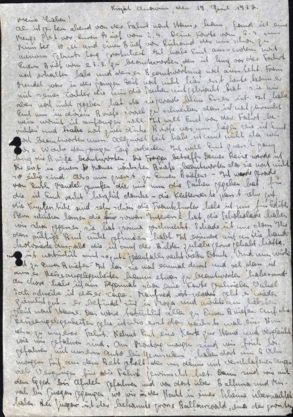 Noch ein paar Worte, bevor ich den Brief abschicke. Wir brauchen wahrscheinlich in dieser Woche mittags schon nicht mehr zu arbeiten, da augenblicklich wenig zu tun ist. - Vorhin hbae ich mit Fritzens Frau telefoniert und bin zum jetzigen Schabbath eingeladen worden. Wenn nichts dazwischen kommt, werde ich nun endgültig fahren. Ich werde dann auch die Eltern von Benno Grünfelder besuchen. Und damit Schluss für heute.