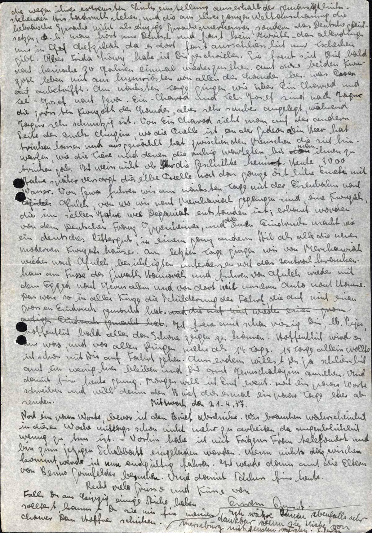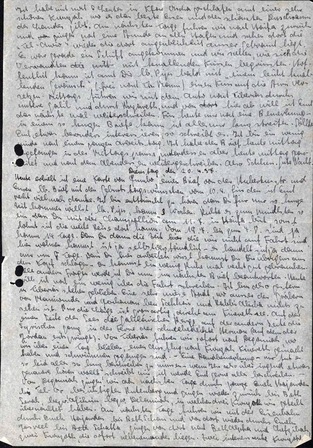 Heute erhielt ich eine Karte von Jumbo, einen Brief von der Hubertusstr. und Euren lb. Brief mit den Geburtstagswünschen vom 10.4., für den ich Euch recht vielmals danke. Ich bin enttäuscht zu hören, dass Du für nur so kurze Zeit kommen willst, lb. Pips, kaum 3 Wochen. Richte es zum mindesten so ein, dass Du mit der „Champollion” am 11.7. in Haifa bist, sonst lohnt sich die weite Reise doch kaum. Vom 18.7. bis zum 4.8. sind ja kaum 14 Tage. Dass Du dann die Zeit, die wir nicht auf Fahrt sind, hier wohnen kannst, ist ja selbstverständlich - es handelt sich ja dann nur um 8 Tage. Dass Du hier arbeiten wirst, kannst Du Dir übrigens aus dem Kopf schlagen - Du kannst ein wenig Ruhe mal recht gut gebrauchen. Alle andern Fragen werde ich Dir nun im nächsten Brief beantworten. Heute will ich noch ein wenig über die Fahrt schreiben. Ich bin also gestern in Tiberias stehengeblieben. Eine sehr miese Stadt, wo ausser den Gräbern von Maimonides und Jochanan ben Sakkai und Rabbi Akiba nichts zu sehen ist. Nur die Lage ist grossartig, direkt am Kinerethsee. Auf der einen Seite des Sees die galiläischen Berge, auf der andern Seite die Syrischen, ganz in der Ferne der schneebedeckte Hermon (auf dem der Jordan entspringt). Von Tiberias fuhren wir sofort nach Deganiah, wo wir über einen Tag blieben, einen Ausflug nach Kwuzah Kinereth gemacht haben und schwimmen gegangen sind. - Eine Randbemerkung - mir tut es so leid alles so kurz beschreiben zu müssen - wenn Ihr also über irgend etwas genaueres hören wollt, schreibt mir, ich werde Euch gerne alles beschreiben. - Von Deganiah gingen wir am nächsten Tage durchs ganze Emek Hajarden bis Tel-Or, besichtigten Rutenberg und gingen wieder zurück bis Beth Serah bezw. Afikim, bezw. Delamiah, in welchen drei Kwuzoth wir geteilt übernachtet haben. Am nächsten Tage fuhren wir mit der Eisenbahn durchs Emek Hajarden bis Beth Schan und von dort wieder durchs Emek Jesreel bis Schatta, gingen von dort nach Beth Alpha und Chefzibah, zwei Kwuzoth, die sofort nebeneinander liegen. Zwei interessante Kwuzoth,