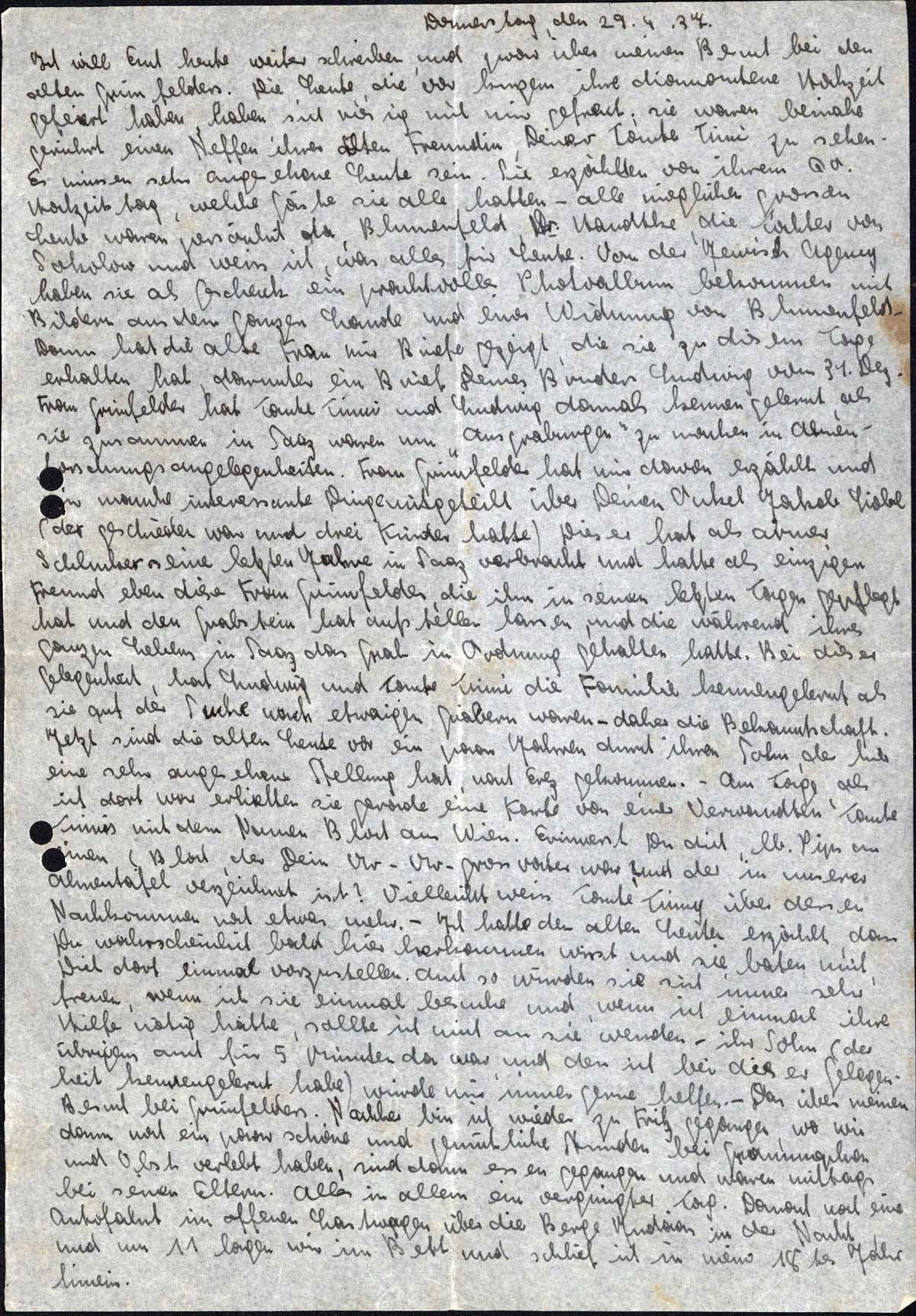 Ich will Euch heute weiter schreiben, und zwar über meinen Besuch bei den alten Grünfelders. Die Leute, die vor kurzem ihre diamantene Hochzeit gefeiert haben, haben sich riesig mit mir gefreut; sie waren beinahe gerührt einen Neffen ihrer alten Freundin, Deiner Tante Tinni zu sehen. Es müssen sehr angesehene Leute sein. Sie erzählten von ihrem 60. Hochzeitstag, welche Gäste sie alle hatten - alle möglichen grossen Leute waren persönlich da, Blumenfeld, Dr. Handtke, die Tochter von Sokolow und weiss ich, was alles für Leute. Von der Jewish Agency haben sie als Geschenk ein prachtvolles Photoalbum bekommen mit Bildern aus dem ganzen Lande und einer Widmung von Blumenfeld. Dann hat die alte Frau mir Briefe gezeigt, die sie zu diesem Tage erhalten hat, darunter ein Brief Deines Bruders Ludwig vom 31. Dez. Frau Grünfelder hat Tante Tinni und Ludwig damals kennengelernt, als sie zusammen in Saaz waren um „Ausgrabungen” zu machen in Ahnenforschungsangelegenheiten. Frau Grünfelder hat mir davon erzählt und mir manche interessante Dinge mitgeteilt über Deinen Onkel Jadob Liobl (der geschieden war und drei Kinder hatte). Dieser hat als armer Schlucker seine letzten jahre in Saaz verbracht und hatte als einzigen Freund eben diese Frau Grünfelder, die ihn in seinen letzten Tagen gepflegt hat und den Grabstein hat aufstellen lassen, und die während ihres ganzen Lebens in Saaz das Grab in Ordnung gehalten hatte. Bei dieser Gelegenheit, hat Ludwig und Tante Tinni die Familie kennengelernt als sie auf der Suche nach etwaigen Gräbern waren - daher die Bekanntschaft. Jetzt sind die alten Leute vor ein paar Jahren durch ihren Sohn, der hier eine sehr angesehene Stellung hat, nach Erez gekommen. - Am Tage, als ich dort war erhielten sie gerade eine Karte von einer Verwandten Tante Tinnis mit dem Namen Blod aus Wien. Erinnerst Du Dich, lb. Pips, an einen Blod, der Dein Ur-Ur-Grossvater war, und der in unserer Ahnentafel verzeichnet ist? Vielleicht weiss Tante Tinny über dessen Nachkommen noch etwas mehr. - Ich hatte den alten Leuten erzählt, dass Du wahrscheinlich bald hier herkommen wirst und sie baten mich, Dich doch einmal vorzustellen. Auch so würden sie sich immer sehr freuen, wenn ich sie einmal besuche und, wenn ich einmal ihre Hilfe nötig hätte, sollte ich mich an sie wenden - ihr Sohn (der übrigens auch für 5 Minuten da war und den ich bei dieser Gelegenheit kennengelernt habe) würde mir immer gerne helfen. - Das über meinen Besuch bei Grünfelders. Nachher bin ich wieder zu Fritz gegangen, wo wir dann noch ein paar schöne und gemütliche Stunden bei Grammophon und Obst verlebt haben, sind dann essen gegangen und waren mittags bei seinen Eltern. Alles in allem ein vergnügter Tag. Danach noch eine Autofahrt im offenen Lastwagen über die Berge Judäas in der Nacht und um 11 lagen wir im Bett und schlief ich in mein 18tes Jahr hinein.