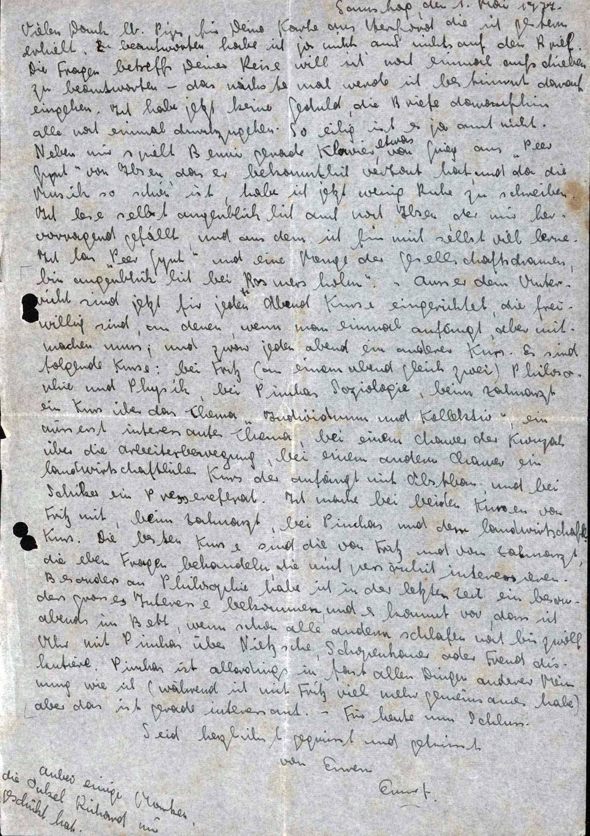 Vielen Dank, lb. Pips, für Deine Karte aus Herford, die ich gestern erhielt. Zu beantworten habe ich ja nichts, auch nichts auf den Brief. Die Fragen betreffs Deiner Reise will ich noch einmal aufschieben zu beantworten - das nächste Mal werde ich bestimmt darauf eingehen. Ich habe jetzt keine Geduld, die Briefe daraufhin alle noch einmal durchzugehen. So eilig ist es ja auch nicht. Neben mir spielt Benni gerade Klavier, etwas von Gries aus „Peer Gynt” von Ibsen, das er bekanntlich vertont hat, und da die Musik so schön ist, habe ich jetzt wenig Ruhe zu schreiben. Ich lese selbst augenblicklich auch noch Ibsen, der mir hervorragend gefällt und aus dem ich für mich selbst viel lerne. Ich las „Peer Gynt“ und eine Menge der Gesellschaftsdramen, bin augenblicklich bei „Rosmersholm“. - Ausser dem Unterricht sind jetzt für jeden Abend Kurse eingerichtet, die freiwillig sind, an denen, wenn man einmal anfängt, aber mitmachen muss, und zwar jeden Abend ein anderer Kurs. Es sind folgende Kurse: bei Fritz (an einem Abend gleich zwei) Philosophie und Physik, bei Pinchas Soziologie, beim Zahnarzt ein Kurs über das Thema „Individuum und Kollektiv“, ein äusserst interessantes Thema, bei einem Chawer der Kwuzah über die Arbeiterbewegung, bei einem andern Chawer ein landwirtschaftlicher Kurs, der anfängt mit Obstbau, und bei Schiker ein Pressereferat. Ich mache bei beiden Kursen von Fritz mit, beim Zahnarzt, bei Pinchas und dem landwirtschaftl. Kurs. Die besten Kurse sind die von Fritz und vom Zahnarzt, die eben Fragen behandeln, die mich persönlich interessieren. Besonders an Philosophie habe ich in der letzten Zeit ein besonders grosses Interesse bekommen, und es kommt vor, dass ich abends im Bett, wenn schon alle andern schlafen, noch bis zwölf Uhr mit Pinchas über Nietzsche, Schopenhauer oder Freud diskutiere. Pinchas ist allerdings in fast allen Dingen anderer Meinung als ich (während ich mit Fritz viel mehr Gemeinsames habe), aber das ist gerade interessant. - Für heute nun Schluss.