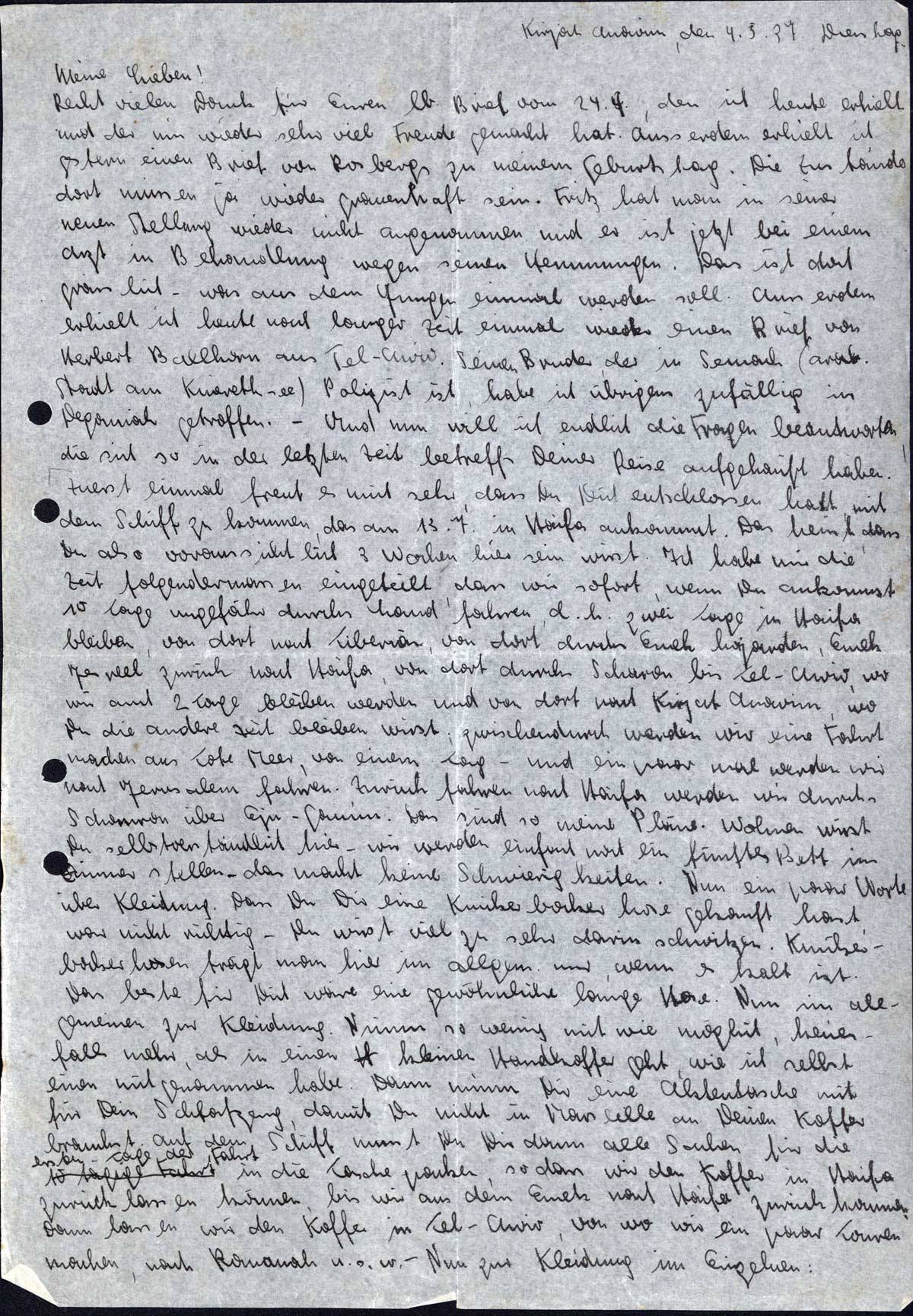 Recht vielen Dank für Euren lb. Brief vom 24.4., den ich heute erhielt und der mir wieder sehr viel Freude gemacht hat. Ausserdem erhielt ich gestern einen Brief von Rosbergs zu meinem Geburtstag. Die Zustände dort müssen ja wieder grauenhaft sein. Fritz hat man in seiner neuen Stellung wieder nicht angenommen und er ist jetzt bei einem Arzt in Behandlung wegen seinen Hemmungen. Das ist doch grässlich - was aus dem Jungen einmal werden soll. Ausserdem erhielt ich heute nach langer Zeit einmal wieder einen Brief von Herbert Ballhorn aus Tel-Aviv. Seinen Bruder, der in Semach (arab. Stadt am Kinerethsee) Polizist ist, habe ich übrigens zufällig in Deganiah getroffen. - Und nun will ich endlich die Fragen beantworten, die sich so in der letzten Zeit betreffs Deiner Reise aufgehäuft haben. Zuerst einmal freut es mich sehr, dass Du Dich entschlossen hast, mit dem Schiff zu kommen, das am 13. 7. in Haifa ankommt. Das heisst, dass Du also voraussichtlich 3 Wochen hier sein wirst. Ich habe mir die Zeit folgendermassen eingeteilt, dass wir sofort, wenn Du ankommst, 10 Tage ungefähr durchs Land fahren, d. h. zwei Tage in Haifa bleiben, von dort nach Tiberias, von dort durchs Emek Hajarden, Emek Jesreel zurück nach Haifa, von dort durchs Scharon bis Tel-Aviv, wo wir auch 2 Tage bleiben werden, und von dort nach Kirjat Anavim, wo Du die andere Zeit bleiben wirst; zwischendurch werden wir eine Fahrt machen ans Tote Meer, von einem Tag - und ein paar Mal werden wir nach Jerusalem fahren. Zurückfahren nach Haifa werden wir durchs Schomron über Ejn-Ganim. Das sind so meine Pläne. Wohnen wirst Du selbstverständlich hier - wir werden einfach noch ein fünftes Bett ins Zimmer stellen - das macht keine Schwierigkeiten. Nun ein paar Worte über Kleidung. Dass Du Dir eine Knickerbockerhose gekauft hast, war nicht richtig - Du wirst viel zu sehr darin schwitzen. Knickerbockerhosen trägt man hier im allgem. nur, wenn es kalt ist. Das beste für Dich wäre eine gewöhnliche lange Hose. Nun im allgemeinen zur Kleidung. Nimm so wenig mit wie möglich, keinesfalls mehr, als in einen kleinen Handkoffer geht, wie ich selbst einen mitgenommen habe. Dann nimm Dir eine Aktentasche mit für Dein Schlafzeug, damit Du nicht in Marseille an Deinen Koffer brauchst. Auf dem Schiff musst Du Dir dann alle Sachen für die ersten Tage der Fahrt in die Tasche packen, so dass wir den Koffer in Haifa zurücklassen können, bis wir aus dem Emek nach Haifa zurückkommen. Dann lassen wir den Koffer in Tel-Aviv, von wo wir ein paar Touren machen, nach Rananah u.s.w. - Nun zur Kleidung im Einzelnen:
