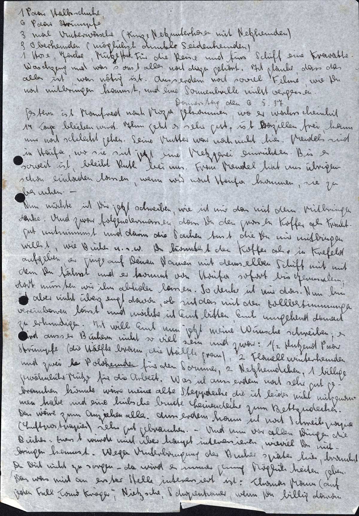 Nun möchte ich Dir jetzt schreiben, wie ich mir das mit dem Mitbringen denke. Und zwar folgendermassen, dass Du den grossen Koffer als Frachtgut mitnimmst und darin die Sachen tust, die Du mir mitbringen willst, wie Bücher u.s.w. Du könntest den Koffer also in Krefeld aufgeben, er ginge auf Deinen Namen mit demselben Schiff mit, mit dem Du fährst und er kommt von Haifa sofort bis Jerusalem; dort müssten wir ihn abholen lassen. So denke ich mir das. Nun bin ich aber nicht überzeugt davon, ob sich das mit den Zollbestimmungen vereinbaren lässt und möchte ich Euch bitten, Euch umgehend danach zu erkundigen. Ich will Euch nun jetzt meine Wünsche schreiben; es wird ausser Büchern nicht so viel sein und zwar: ½ Dutzend Paar Strümpfe (die Hälfte braun, die Hälfte grau), 2 Flanellwinterhemden und zwei Polohemden für den Sommer, 2 Netzhemdchen, 1 billige gewöhnliche Mütze für die Arbeit. Was ich ausserdem noch sehr gut gebrauchen könnte wäre meine alte Steppdecke, die ich leider nicht mitgenommen habe und eine hübsche bunte Leinendecke zum Bettzudecken. Das wäre zum Anziehen alles. Ausserdem kann ich noch Schreibpapier (Luftpostpapier) sehr gut gebrauchen. - Und nun vor allen Dingen die Bücher: Zuerst würde mich überhaupt interessieren, wieviel Du mitbringen kannst. Wegen Unterbringung der Bücher später hier, brauchst Du Dich nicht zu sorgen - da wird es immer genug Möglichkeiten geben. Das was mich an erster Stelle interessiert ist: Thomas Mann (auf jeden Fall „Tonio Kröger”, Nietzsche, Schopenhauer, wenn Du billig daran