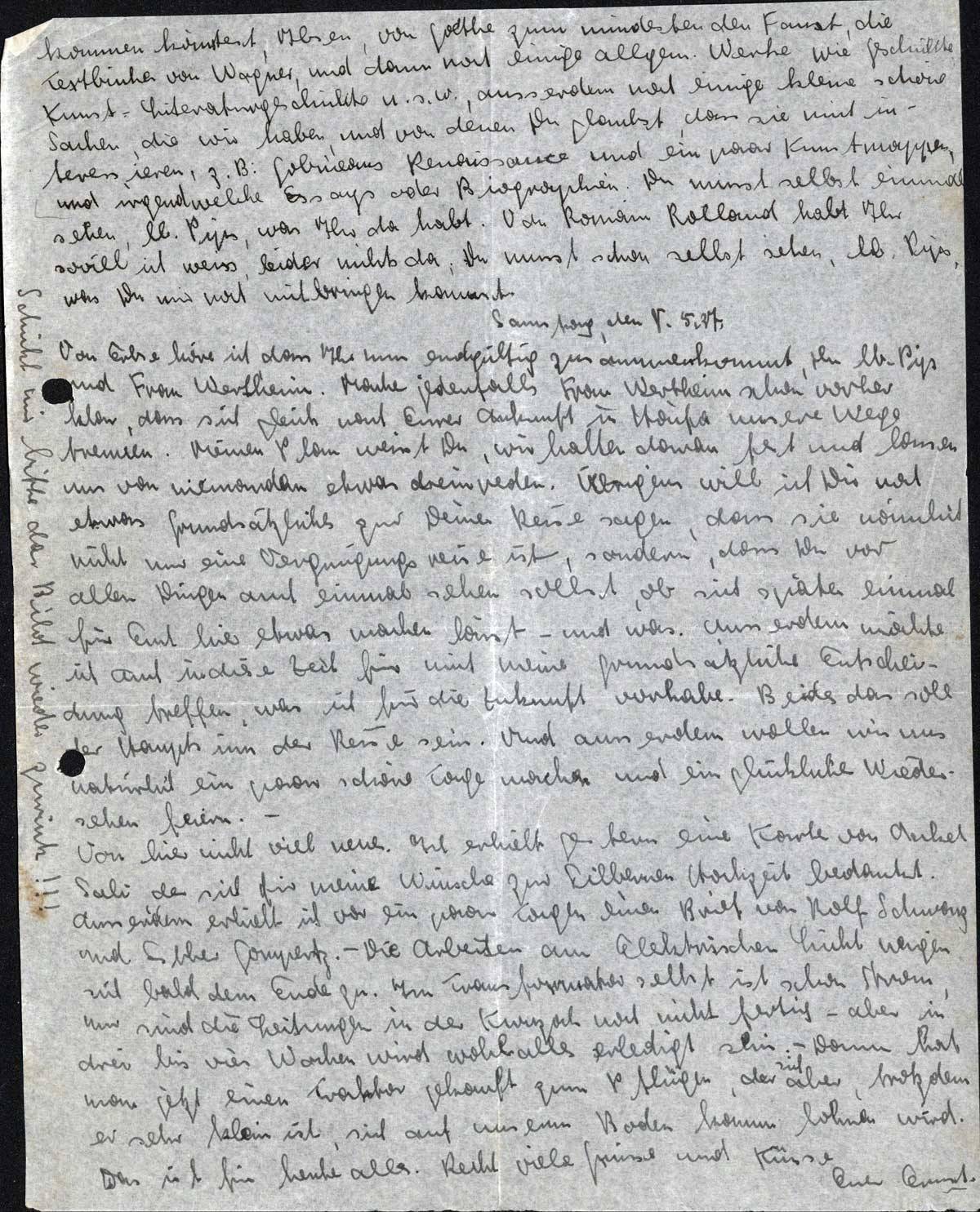 Von Erbse höre ich, dass Ihr nun endgültig zusammen kommt, Du lb. Pips und Frau Wertheim. Mache jedenfalls Frau Wertheim schon vorher klar, dass sich gleich nach Eurer Ankunft in Haifa unsere Wege trennen. Meinen Plan weisst Du, wir halten daran fest und lassen uns von niemandem etwas dreinreden. Übrigens will ich Dir mal etwas Grundsätzliches zu Deiner Reise sagen, dass sie nämlich nicht nur eine Vergnügungsreise ist, sondern, dass du vor allen Dingen auch einmal sehen sollst, ob sich später einmal für Euch hier etwas machen lässt - und was. Ausserdem möchte ich auch in dieser Zeit für mich meine grundsätzliche Entscheidung treffen, was ich für die Zukunft vorhabe. Beides das soll der Hauptsinn der Reise sein. Und ausserdem wollen wir uns natürlich ein paar schöne Tage machen und ein glückliches Wiedersehen feiern. -