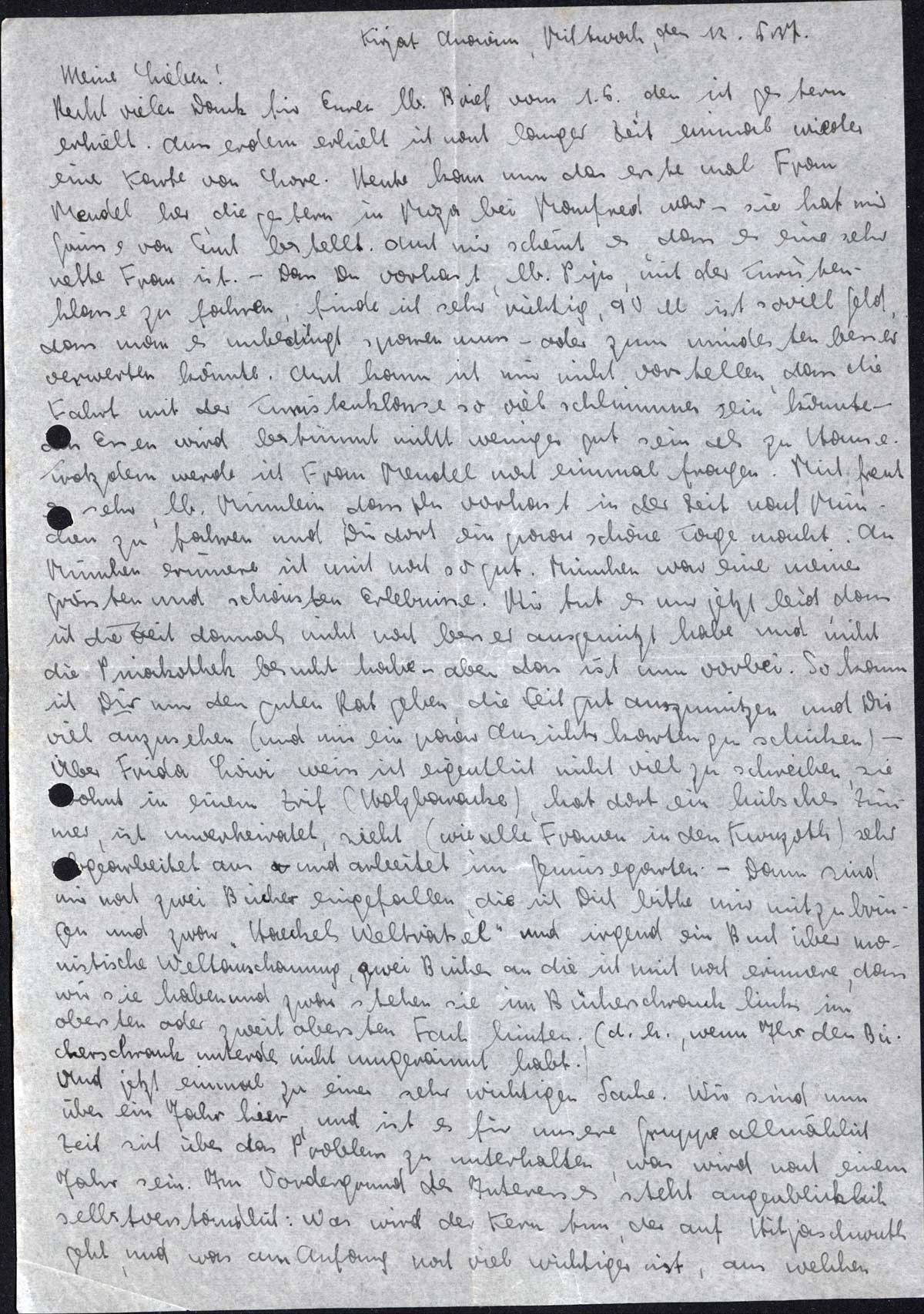 Recht vielen Dank für Euren lb. Brief vom 1.5., den ich gestern erhielt. Ausserdem erhielt ich nach langer Zeit einmal wieder eine Karte von Lore. Heute kam nun das erste Mal Frau Mendel her, die gestern in Moza bei Manfred war - sie hat mir Grüsse von Euch bestellt. Auch mir scheint es, dass es eine sehr nette Frau ist. - Dass Du vorhast, lb. Pips, mit der Touristenklasse zu fahren, finde ich sehr richtig, 90 M ist soviel Geld, dass man es unbedingt sparen muss - oder zum mindesten besser verwerten könnte. Auch kann ich mir nicht vorstellen, dass die Fahrt mit der Touristenklasse so viel schlimmer sein könnte - das Essen wird bestimmt nicht weniger gut sein als zu Hause. Trotzdem werde ich Frau Mendel noch einmal fragen. Mich freut es sehr, lb. Mumlein, dass Du vorhast in der Zeit nach München zu fahren und Dir dort ein paar schöne Tage machst. An München erinnere ich mich noch so gut. München war eine meiner grössten und schönsten Erlebnisse. Mir tut es nur jetzt leid, dass ich die Zeit damals nicht noch besser ausgenutzt habe und nicht die Pinakothek besucht habe - aber dass ist nun vorbei. So kann ich Dir nur den guten Rat geben, die Zeit gut auszunutzen und Dir viel anzusehen (und mir ein paar Ansichtskarten zu schicken) - Über Frida Löwi weiss ich eigentlich nicht viel zu schreiben, sie wohnt in einem [..] (Holzbaracke), hat dort ein hübsches Zimmer, ist unverheiratet, sieht (wie alle Frauen in den Kwuzoth) sehr abgearbeitet aus und arbeitet im Gemüsegarten. - Dann sind mir noch zwei Bücher eingefallen, die ich Dich bitte mir mitzubringen und zwar „Haeckels Welträtsel” und irgend ein Buch über monistische Weltanschauung, zwei Bücher an die ich mich noch erinnere, dass wir sie haben und zwar stehen sie im Bücherschrank links im obersten oder zweitobersten Fach hinten. (d. h., wenn Ihr den Bücherschrank unterdes nicht umgeräumt habt.)