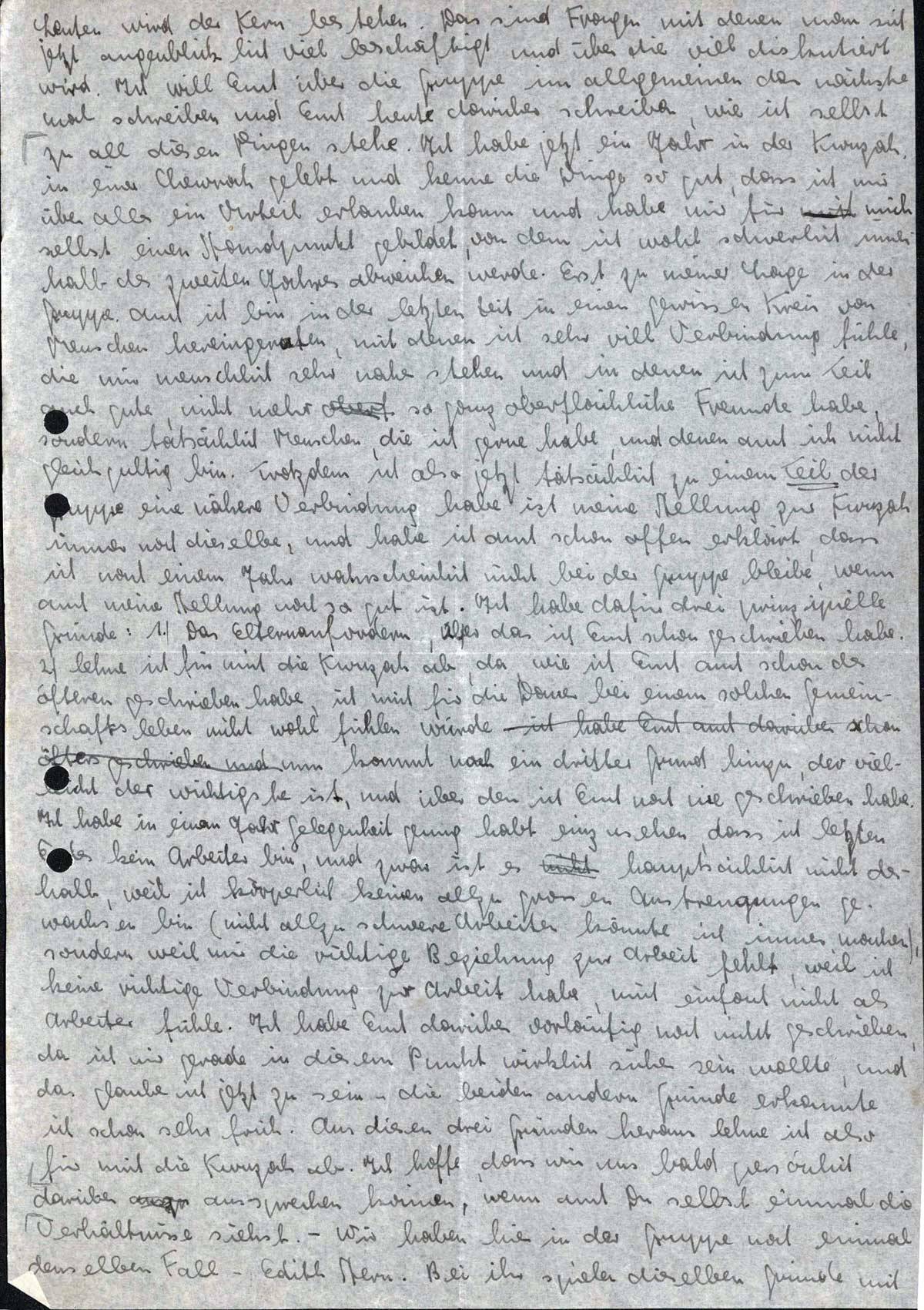 Leuten wird der Kern bestehen. Das sind Fragen, mit denen man sich jetzt augenblicklich viel beschäftigt und über die viel diskutiert wird. Ich will Euch über die Gruppe im allgemeinen das nächste Mal schreiben und Euch heute darüber schreiben, wie ich selbst zu all diesen Dingen stehe. Ich habe jetzt ein Jahr in der Kwuzah in einer Chewrah gelebt und kenne die Dinge so gut, dass ich mir über alles ein Urteil erlauben kann und habe mir für mich selbst einen Standpunkt gebildet, von dem ich wohl schwerlich innerhalb des zweiten Jahres abweichen werde. Erst zu meiner Lage in der Gruppe. Auch ich bin in der letzten Zeit in einen gewissen Kreis von Menschen hereingeraten, mit denen ich sehr viel Verbindung fühle, die mir menschlich sehr nahe stehen und in denen ich zum Teil auch gute, nicht mehr so ganz oberflächliche Freunde habe, sondern tatsächlich Menschen, die ich gerne habe, und denen auch ich nicht gleichgültig bin. Trotzdem ich also jetzt tatsächlich zu einem Teil der Gruppe eine nähere Verbindung habe, ist meine Stellung zur Kwuzah immer noch dieselbe, und habe ich auch schon offen erklärt, dass ich nach einem Jahr wahrscheinlich nicht bei der Gruppe bleibe, wenn auch meine Stellung noch so gut ist. Ich habe dafür drei prinzipielle Gründe: 1. das Elternanfordern, über das ich Euch schon geschrieben habe; 2. lehne ich für mich die Kwuzah ab, da, wie ich Euch schon des öfteren geschrieben habe, ich mich für die Dauer bei einem solchen Gemeinschaftsleben nicht wohl fühlen würde. Nun kommt noch ein dritter Grund hinzu, der vielleicht der wichtigste ist, und über den ich Euch noch nie geschrieben habe. Ich habe in einem Jahr Gelegenheit genug gehabt einzusehen, dass ich letzten Endes kein Arbeiter bin, und zwar ist es hauptsächlich nicht deshalb, weil ich körperlich keinen allzu großen Anstrengungen gewachsen bin (nicht allzu schwere Arbeiten könnte ich immer machen), sondern weil mir die richtige Beziehung zur Arbeit fehlt, weil ich keine richtige Verbindung zur Arbeit habe, mich einfach nicht als Arbeiter fühle. Ich habe Euch darüber vorläufig noch nicht geschrieben, da ich mir gerade in diesem Punkt wirklich sicher sein wollte, und das glaube ich jetzt zu sein - die beiden andern Gründe erkannte ich schon sehr früh. Aus diesen drei Gründen heraus lehne ich also für mich die Kwuzah ab. Ich hoffe, dass wir uns bald persönlich darüber aussprechen können, wenn auch Du selbst einmal die Verhältnisse siehst. - Wir haben hier in der Gruppe noch einmal denselben Fall - Edith Stern. Bei ihr spielen dieselben Gründe mit,