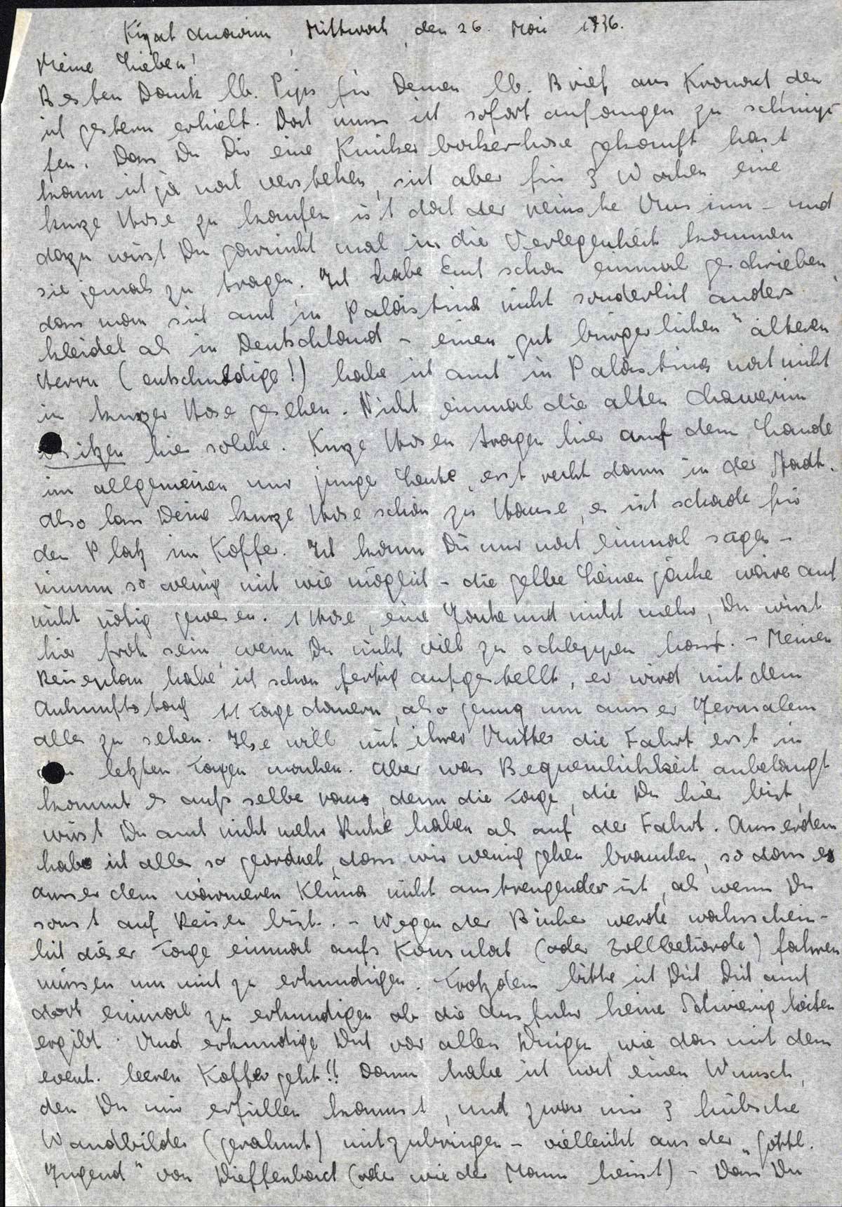 Besten Dank lb. Pips für Deinen lb. Brief aus Kronach, den ich gestern erhielt. Doch muss ich sofort anfangen zu schimpfen. Dass Du Dir eine Knickerbockerhose gekauft hast, kann ich ja noch verstehen, sich aber für 3 Wochen eine kurze Hose zu kaufen ist doch der reinste Unsinn - und dazu wirst Du garnicht mal in die Verlegenheit kommen sie jemals zu tragen. Ich habe Euch schon einmal geschrieben, dass man sich auch in Palästina nicht sonderlich anders kleidet als in Deutschland - einen „gut bürgerlichen” älteren Herrn (entschuldige!) habe ich auch in Palästina noch nicht in kurzer Hose gesehen. Nicht einmal die alten Chawerim besitzen hier solche. Kurze Hosen tragen hier auf dem Lande im allgemeinen nur junge Leute, erst recht dann in der Stadt. Also lass Deine kurze Hose schön zu Hause, es ist schade für den Platz im Koffer. Ich kann Dir nur noch einmal sagen - nimm so wenig mit wie möglich - die gelbe Leinenjacke wäre auch nicht nötig gewesen. 1 Hose, eine Jacke und nicht mehr, Du wirst hier froh sein, wenn Du nicht viel zu schleppen hast. - Meinen Reiseplan habe ich schon fertig aufgestellt, er wird mit dem Ankunftstag 11 Tage dauern, also genug um ausser Jerusalem alles zu sehen. Ilse will mit ihrer Mutter die Fahrt erst in den letzten Tagen machen. Aber was Bequemlichkeit anbelangt kommt es aufs selbe raus, denn die Tage, die Du hier bist, wirst Du auch nicht mehr Ruhe haben als auf der Fahrt. Ausserdem habe ich alles so geordnet, dass wir wenig gehen brauchen, so dass es ausser dem wärmeren Klima nicht anstrengender ist, als wenn Du sonst auf Reisen bist. - Wegen der Bücher werde wahrscheinlich dieser Tage einmal aufs Konsulat (oder Zollbehörde) fahren müssen um mich zu erkundigen. Trotzdem bitte ich Dich, Dich auch dort einmal zu erkundigen, ob die Ausfuhr keine Schwierigkeiten ergibt. Und erkundige Dich vor allen Dingen, wie das mit dem event. leeren Koffer geht!! Dann habe ich noch einen Wunsch, den Du mir erfüllen kannst, und zwar mir 3 hübsche Wandbilder (gerahmt) mitzubringen - vielleicht aus der „Göttl. Jugend” von Dieffenbach (oder wie der Mann heisst) - Dass Du