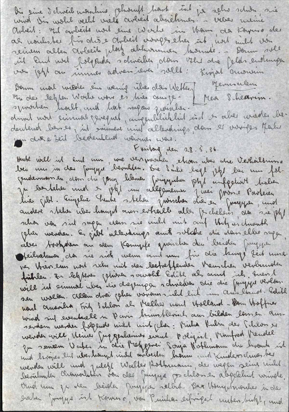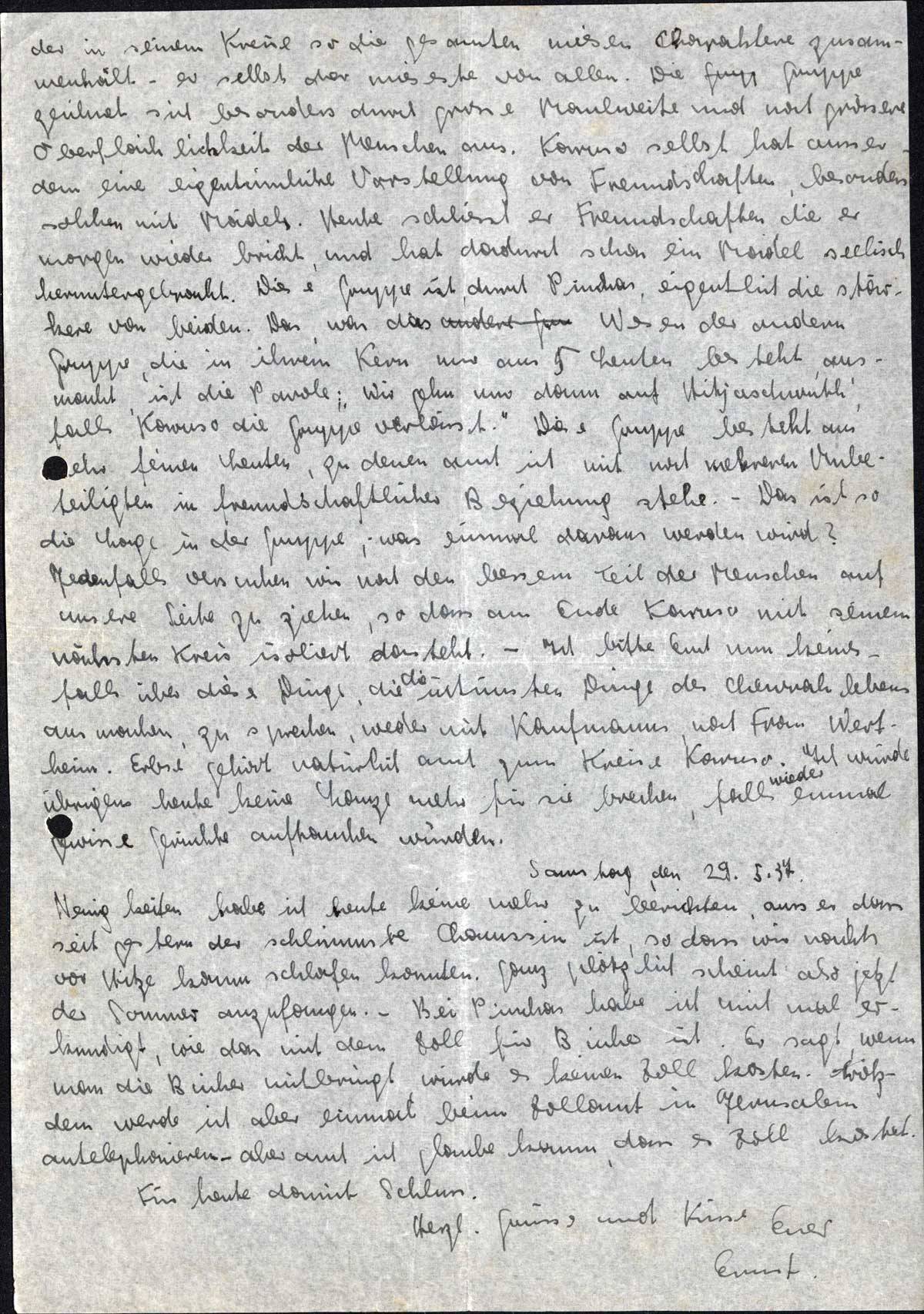 der in seinem Kreise so die gesamten miesen Charaktere zusammenhält - er selbst der mieseste von allen. Die Gruppe zeichnet sich besonders durch grosse Maulweite und noch grössere Oberflächlichkeit der Menschen aus. Karuso selbst hat ausserdem eine eigentümliche Vorstellung von Freundschaften, besonders solchen mit Mädels. Heute schliesst er Freundschaften, die er morgen wieder bricht, und hat dadurch schon ein Mädel seelisch heruntergebracht. Diese Gruppe ist, durch Pinchas, eigentlich die stärkere von beiden. Das, was das Wesen der andern Gruppe, die in ihrem Kern nur aus 5 Leuten besteht, ausmacht, ist die Parole: „Wir gehn nur dann auf Hitjaschwuth, falls Karuso die Gruppe verlässt.” Diese Gruppe besteht aus sehr feinen Leuten, zu denen auch ich mit noch mehreren Unbeteiligten in freundschaftlicher Beziehung stehe. - Das ist so die Lage in der Gruppe; was einmal daraus werden wird? Jedenfalls versuchen wir noch den besseren Teil der Menschen auf unsere Seite zu ziehen, so dass am Ende Karuso mit seinem nächsten Kreis isoliert dasteht. - Ich bitte Euch nun keinesfalls über diese Dinge, die die intimsten Dinge des Chewrahlebens ausmachen, zu sprechen, weder mit Kaufmanns, noch Frau Wertheim. Erbse gehört natürlich auch zum Kreise Karuso. Ich würde übrigens heute keine Lanze mehr für sie brechen, falls wieder einmal gewisse Gerüchte auftauchen würden.