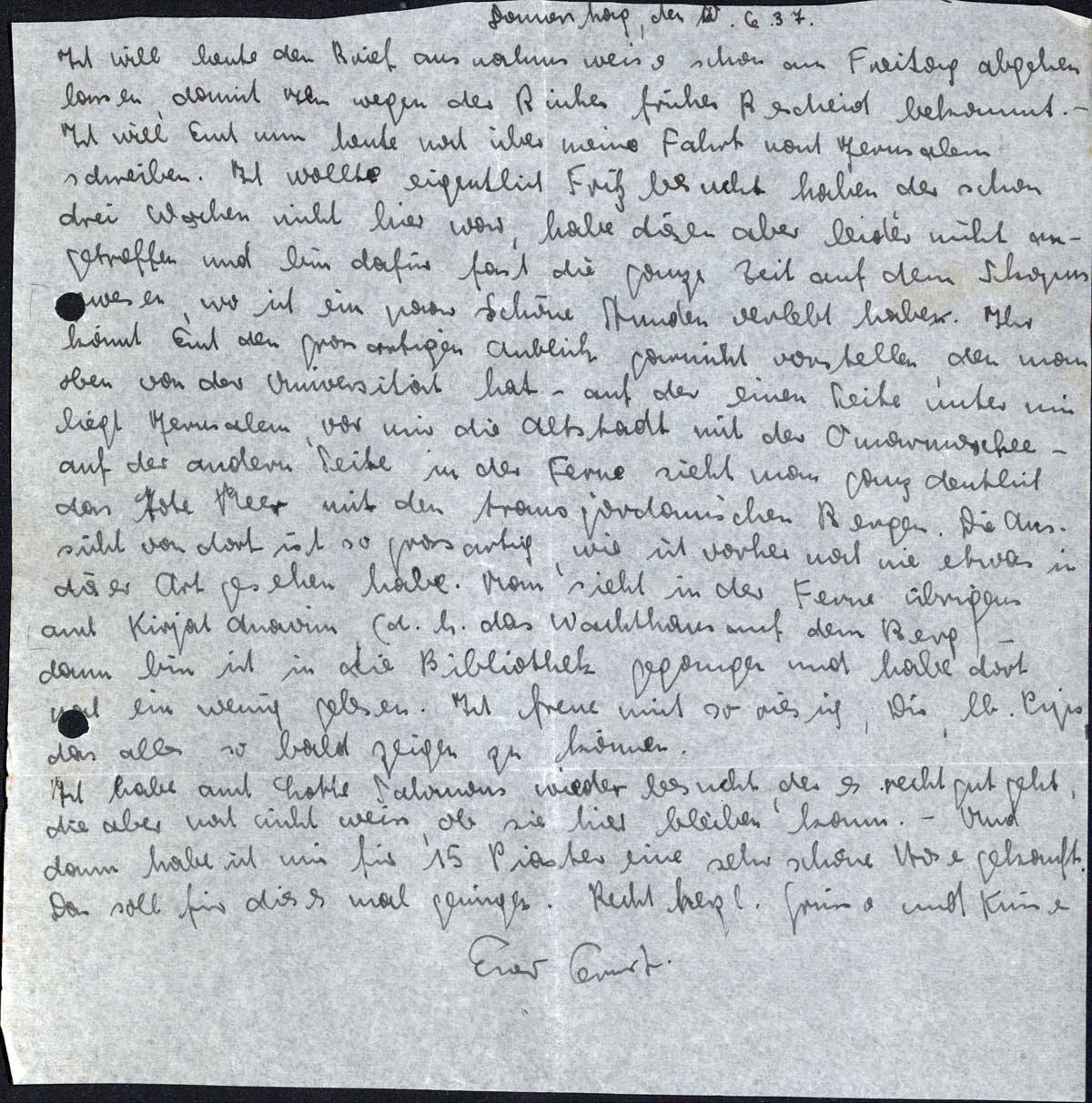 Ich will heute den Brief ausnahmsweise schon am Freitag abgeben lassen, damit Ihr wegen der Bücher früher Bescheid bekommt. - Ich will Euch nun heute noch über meine Fahrt nach Jerusalem schreiben. Ich wollte eigentlich Fritz besucht haben, der schon drei Wochen nicht hier war, habe diesen aber leider nicht angetroffen und bin dafür fast die ganze Zeit auf dem Skopus gewesen, wo ich ein paar schöne Stunden verlebt habe. Ihr könnt Euch den grossartigen Anblick garnicht vorstellen, den man oben von der Universität hat - auf der einen Seite unter mir liegt Jerusalem, vor mir die Altstadt mit der Omarmoschee - auf der andern Seite in der Ferne sieht man ganz deutlich das Tote Meer mit den transjordanischen Bergen. Die Aussicht von dort ist so grossartig, wie ich vorher noch nie etwas in dieser Art gesehen habe. Man sieht in der Ferne übrigens auch Kirjat Anavim (d. h. das Wachthaus auf dem Berg) - dann bin ich in die Bibliothek gegangen und habe dort noch ein wenig gelesen. Ich freue mich so riesig, Dir, lb. Pips, das alles so bald zeigen zu können.